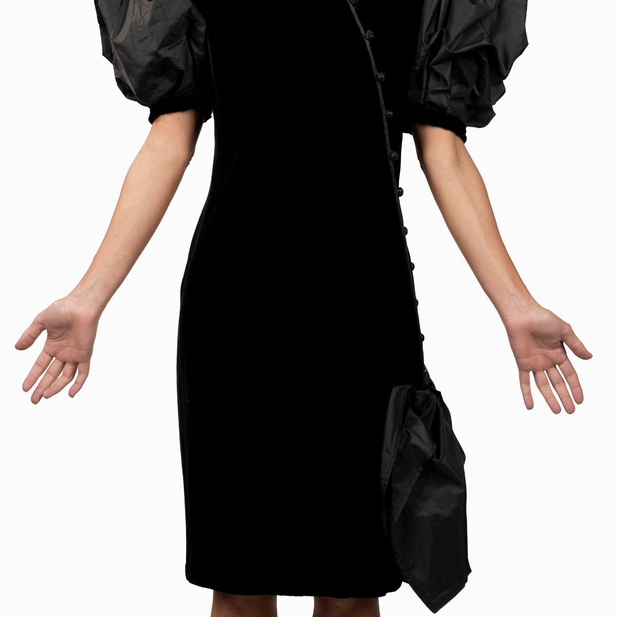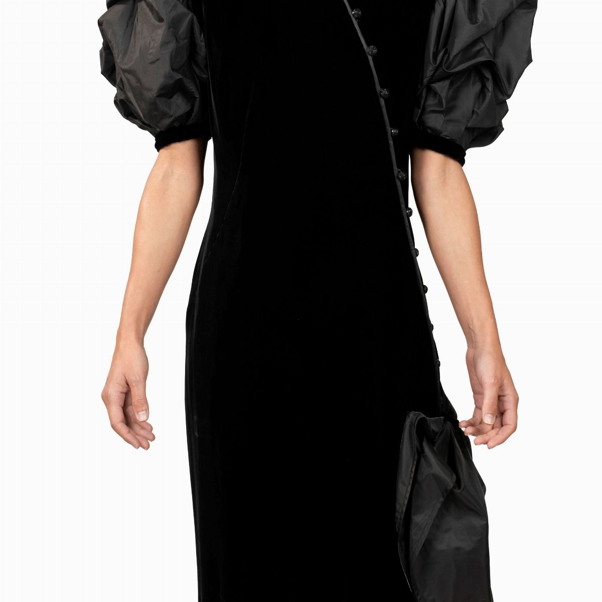 in velvet, asymmetric closure, short taffeta balloon sleeves, black, size XS