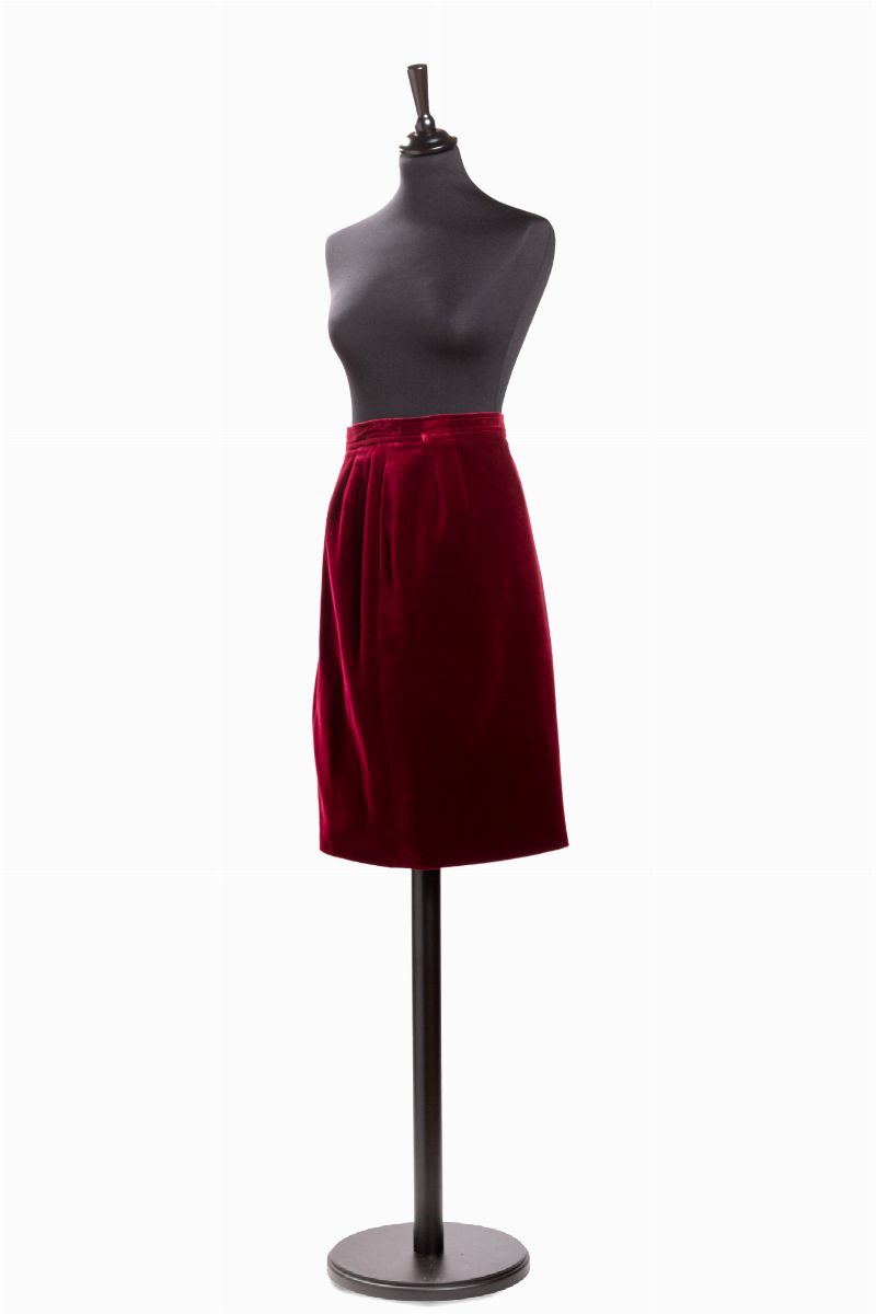 Lot comprising of a wool and fabric burgundy colored cape and skirt, cape french size 38 and skirt french size 42 (defects)