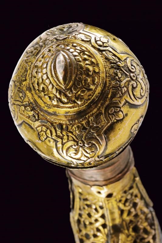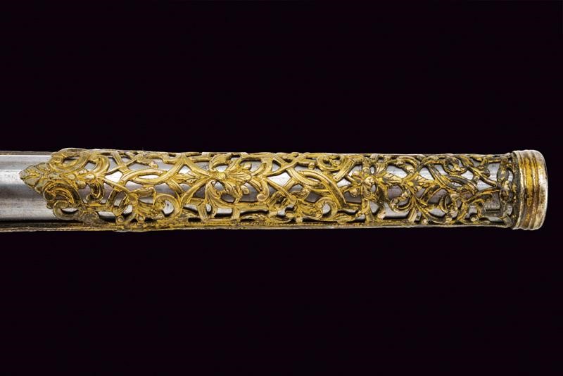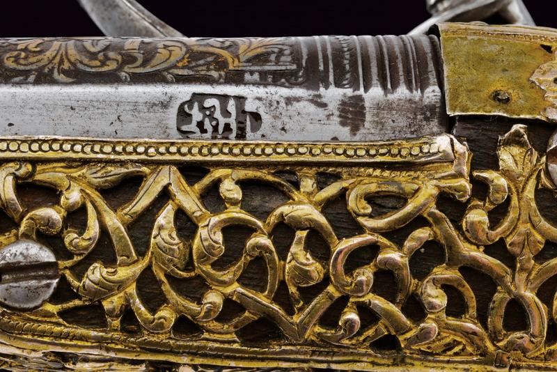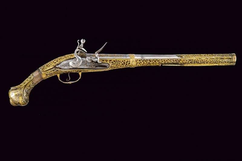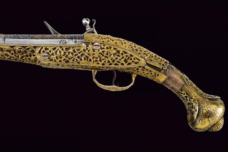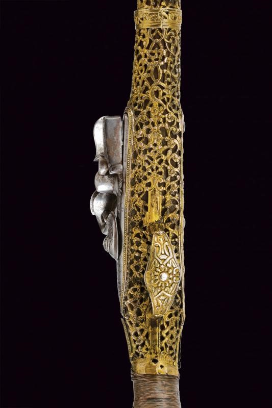 Smoothbore, three-stage, round barrel, engraved with fine floral motifs with remains of gildiing framed by rings at the first part, a clearly visible mark on the left side; the other two segments are divided by rings. Flintlock engraved en suite with the barrel (without gilding). Wooden full stock fully covered with gilt silver mounts richly pierced and engraved with floral motifs. Solid trigger guard and pommel decorated in relief. Long barrel bracket decorated en suite. Grip covered with copper wire. Small defects and missing parts.