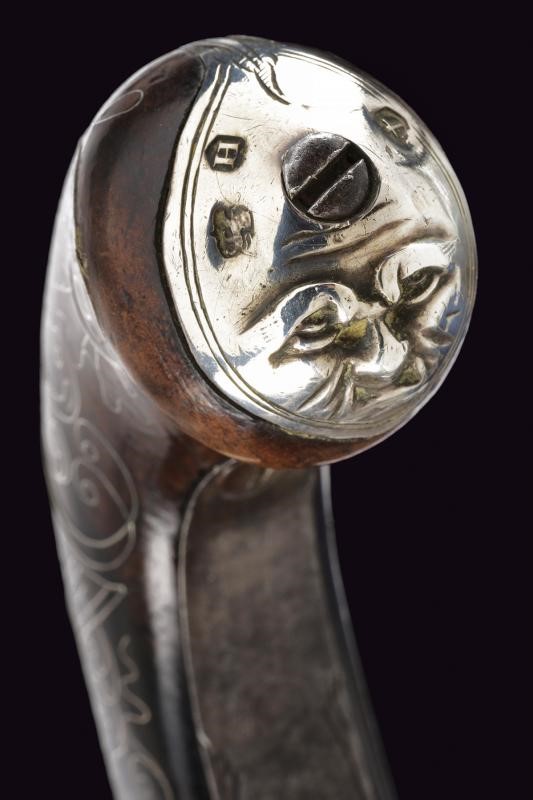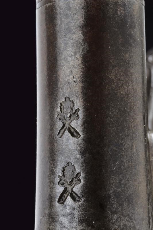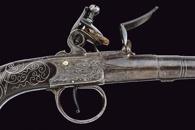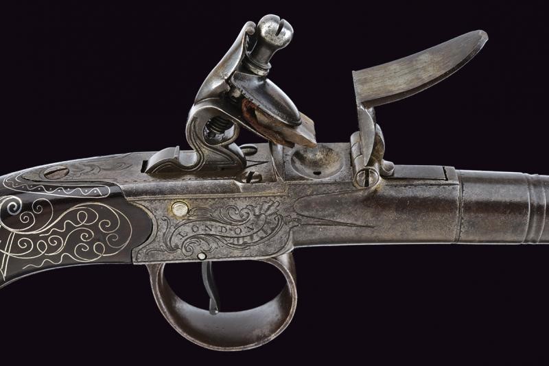 Smoothbore, round, turn-off, 11 mm cal. barrel, moulded nozzle, with marks of the test bench; boxlock type frame signed "HALL" and "LONDON" between floral motifs, browned like the barrel. Wooden butt richly decorated with filigree silver spirals. The butt-plate with embossed silver mask provided with three marks. Working mechanism.