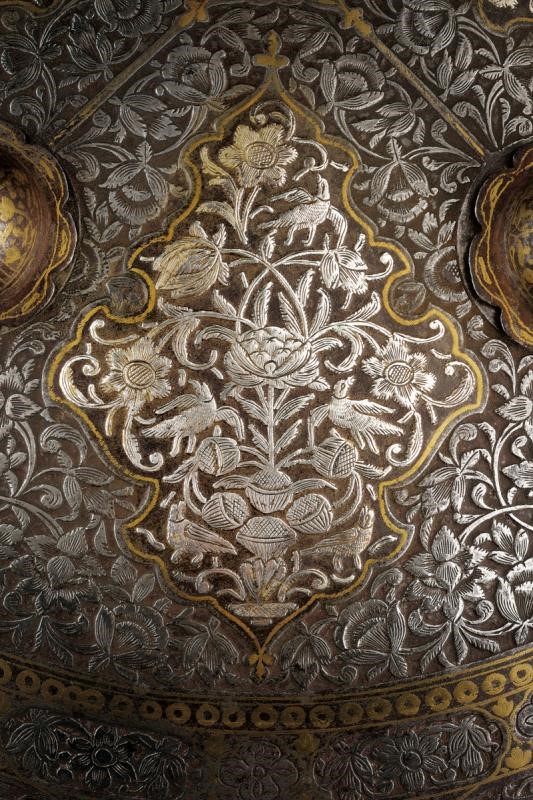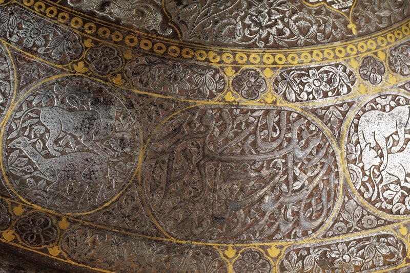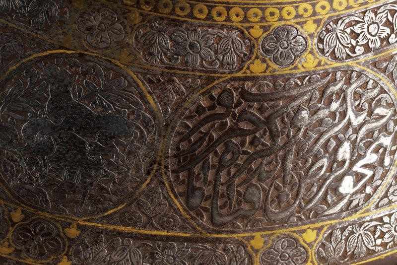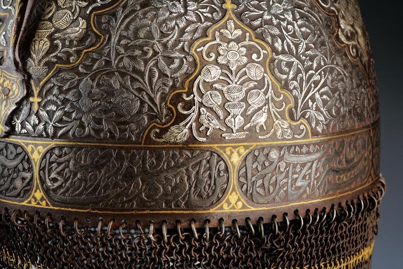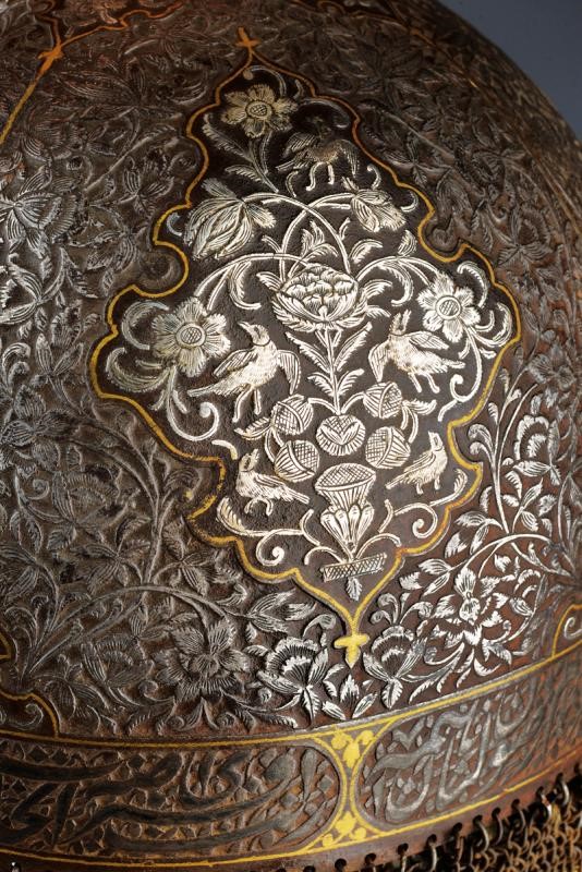 Helmet with high, hemispherical, iron skull, the tip at the top (missing) is replaced by a wooden tip and a base sculpted and painted in gold-yellow (very similar to the original). The entire surface finely engraved with floral motifs depicting four silver cartouches depicting birds, vases and floral motifs, the frames of the cartouches in gold, between these four there are further smaller cartouches at the base and top; the lower border with a further eight cartouches with the inscription in Arabic, remains of silver decorations and gold frames. The front with a sliding nosepiece engraved with floral motifs, on the sides two plume-holders. Fine mail neck-defense (small missing parts) with small simple closed rings, decorated with brass rings, provided with long fringes. The sipar (diameter 45 cm), of a strongly convex circular shape, provided with four flower-shaped studs, reinforced and riveted border; the entire surface decorated en suite with the helmet, the rim with a wide band featuring cartouches depicting hunting scenes with tigers and antelopes and inscriptions in Arabic. The inside surface lined with original fabric (missing parts) and provided with four (missing) rings for the handles.