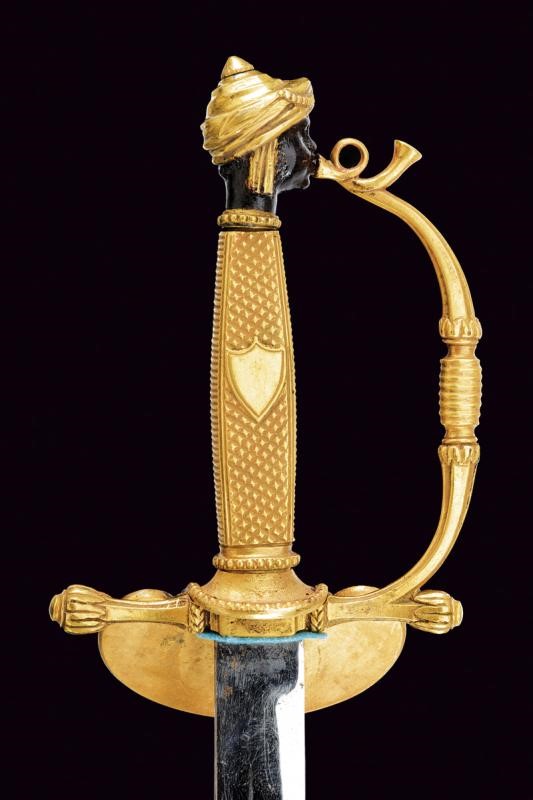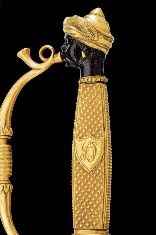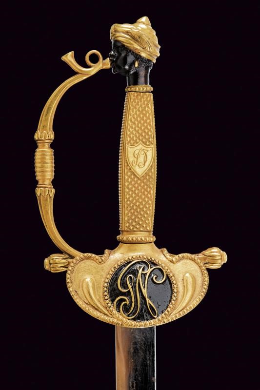 Straight, single-and-false-edged blade, with fuller and ribbed tip; nickel-plated. Gilt brass hilt, shell-guard with beaded border, featuring a circle (also beaded) in the centre and surrounding the crossed numbers and letters "GN" in italics, black background; straight quillons with bud-shaped ends; guard with high end culminating in a hunting horn; pommel shaped as a black-enameled (refreshed) Moor's head with gilt turban. Gilt brass grip of rectangular shape, checkered and surmounted in the centre, on both sides, with a shield with owner's numbers (a smoothbore shield). Leather scabbard with brass mounts.