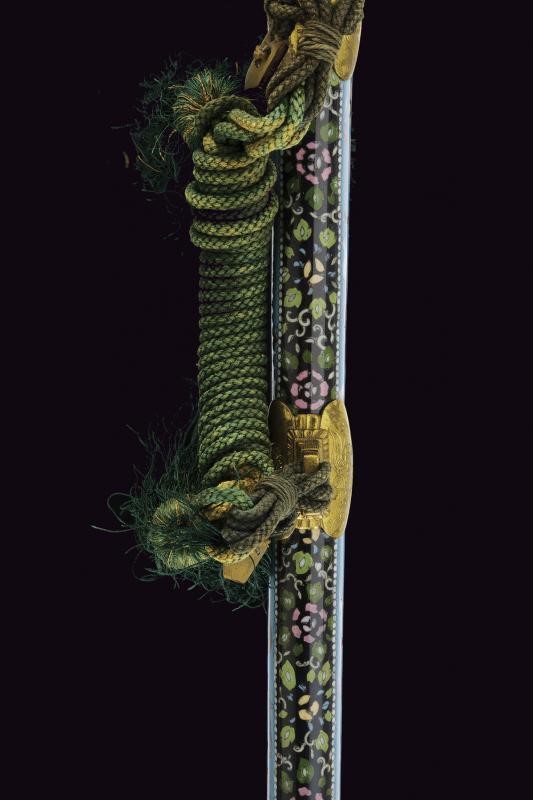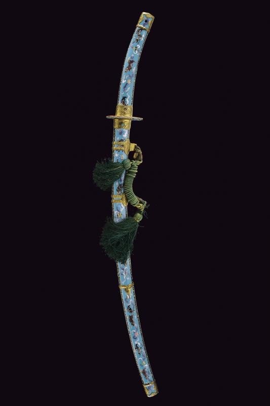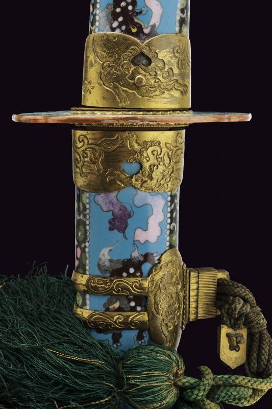 Beautiful koshirae, with polychrome enamels depicting dragons and florals on a blue background, gilded copper tsuba decorated en suite. Brass tachi mounts, richly engraved with dragons and florals. The grip with udenuki/o rope hole. The saya with ashi-ma complete with ashikawa. With a wooden, substitutive blade inside. Very rare.