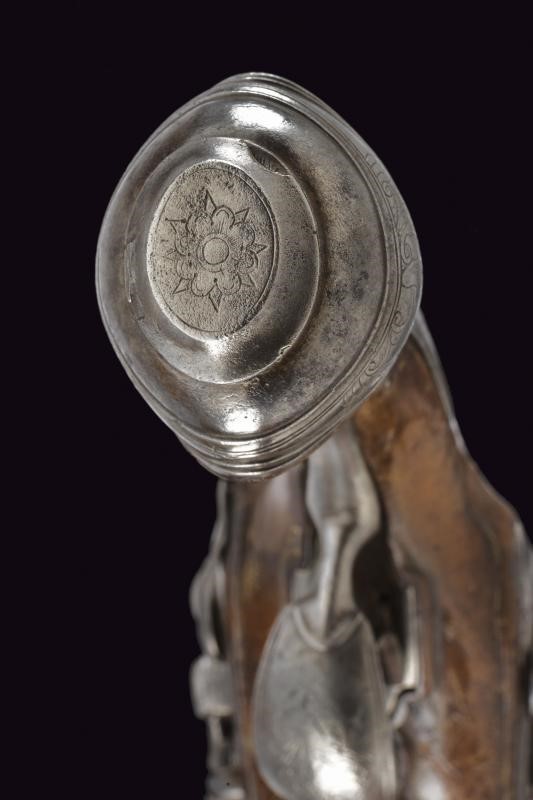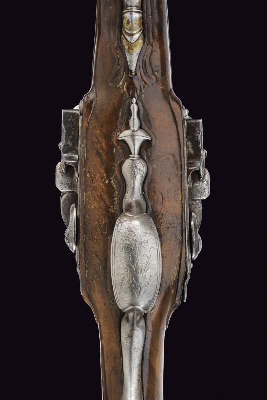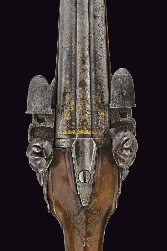Smoothbore, round, juxtaposed, 10 mm cal. barrels, with rib, engraved and gold-plated base with floral motifs; flintlock with flat lock plates (mechanism needs revision). Wooden, full stock (minor restoration) with iron mounts engraved with floral motifs. Iron ramrod.
