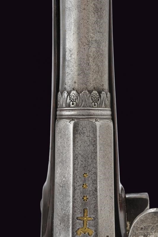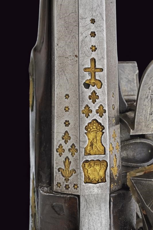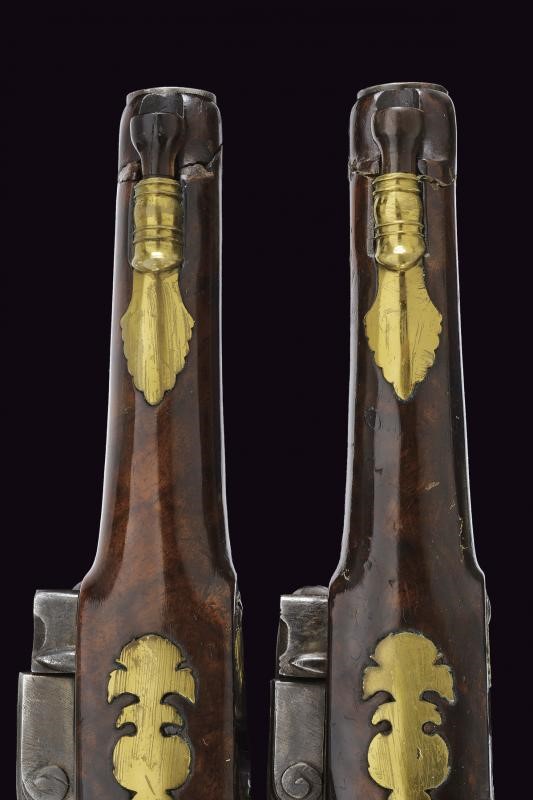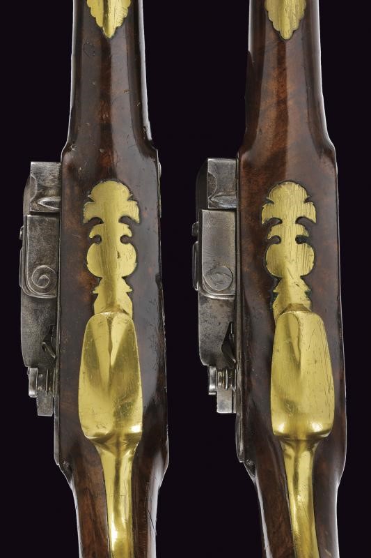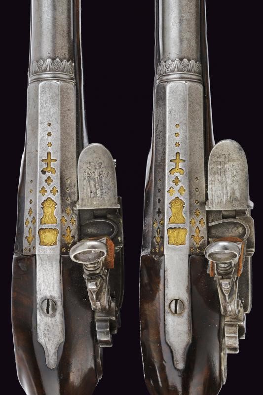 Smoothbore, two-stage, 16 mm cal. barrels, the first part octagonal with marks of the Real Fabrica of Naples including a cross, lilies and flowers gold-inlaid, after a ring and round acanthus leaves; elegant miquelet locks, the plates with Real Fabrica mark. Full stocks (both with minor damage to the fore-end cap) with brass mounts. Horn-tipped wooden ramrods (missing parts) and iron cartridge extractors.