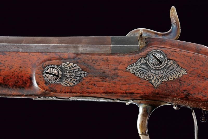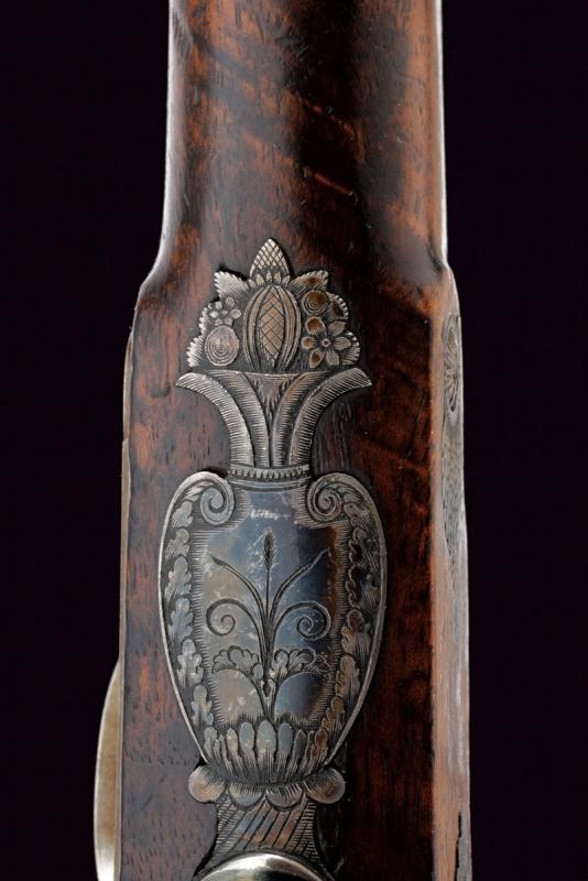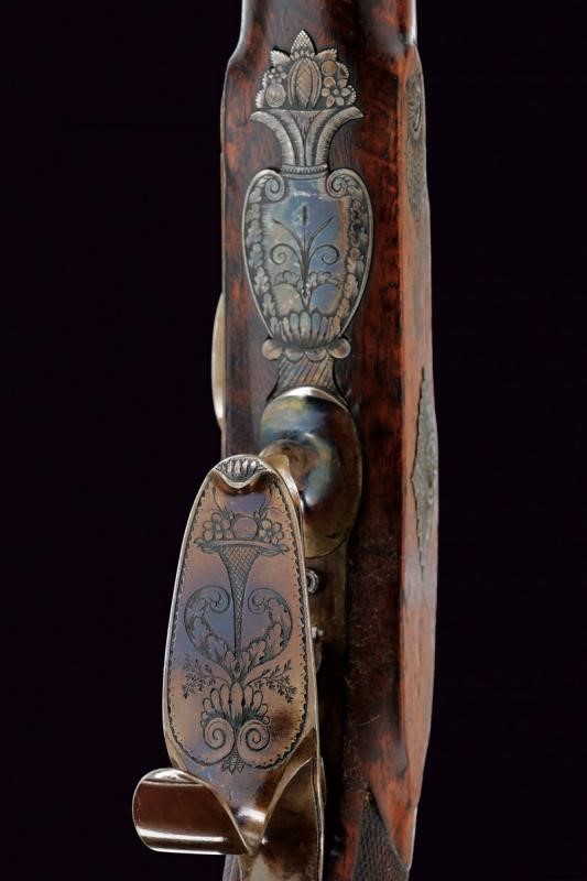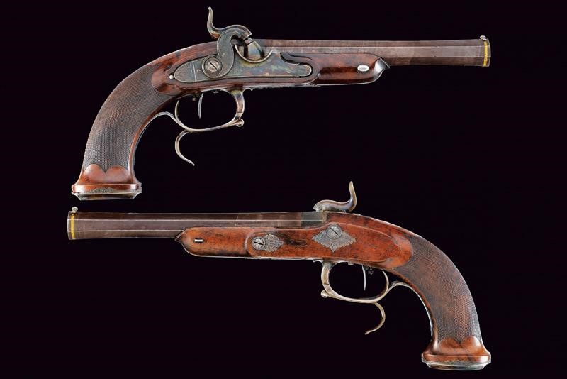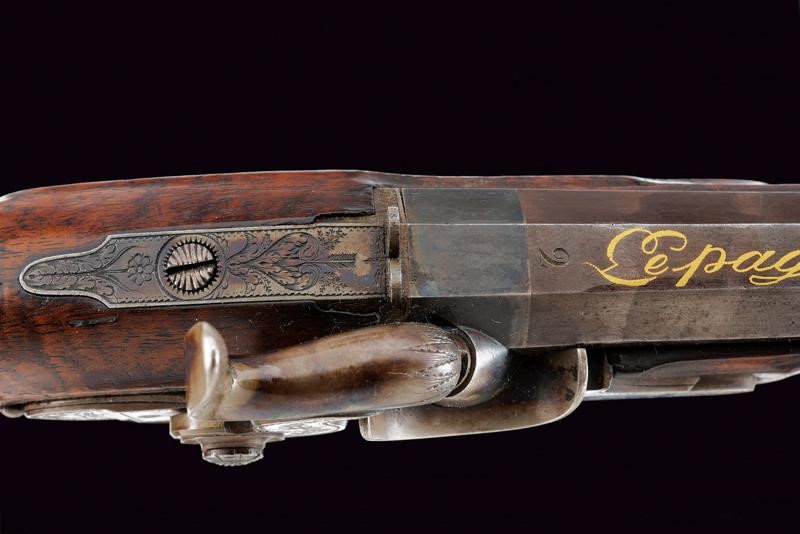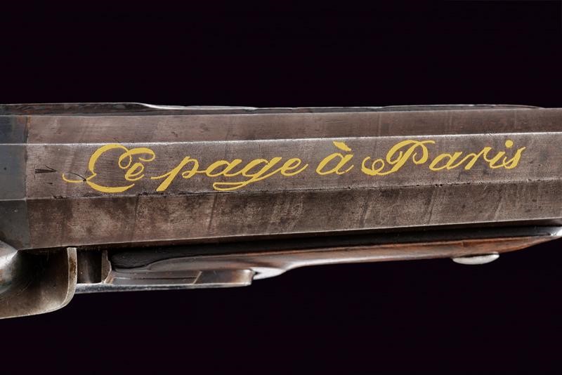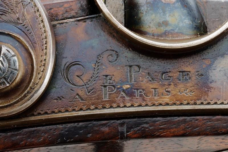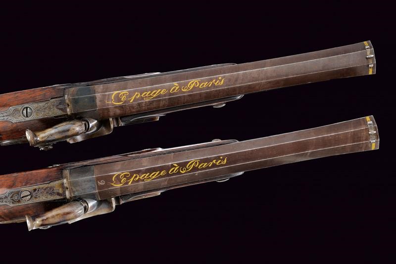 Octagonal, micro-rifled, 13 mm cal. barrels (clean bores, visible rifling), blued and with damascus design, signed "Le Page a Paris" in gold and numbered "1" and "2". Slightly bell mouthed nozzles decorated with a frame in gold and provided with a precision foresight. Finely engraved tangs with a heart, arrow and floral motifs; provided with rear sight. Forward spring locks signed "LA PAGE A PARIS / AQUEB.ER DE L'EMPEREUR"; cocks and lock plates engraved at the borders and with floral motifs. Wooden stocks with micro-checkered butts. Beautiful browned iron hilt finely engraved with cornucopias and floral motifs. Trigger guards with finger supports. Triggers with set triggers. Working mechanism. For a case, therefore without ramrod.