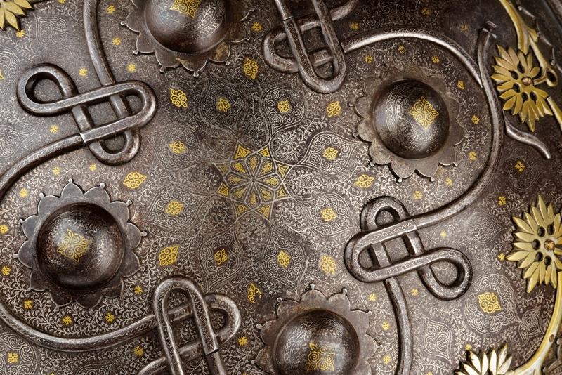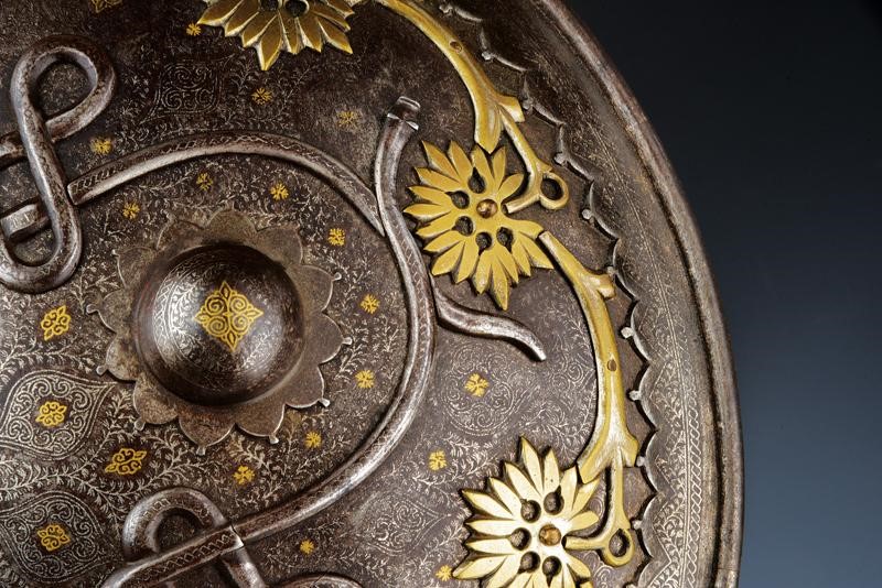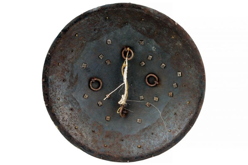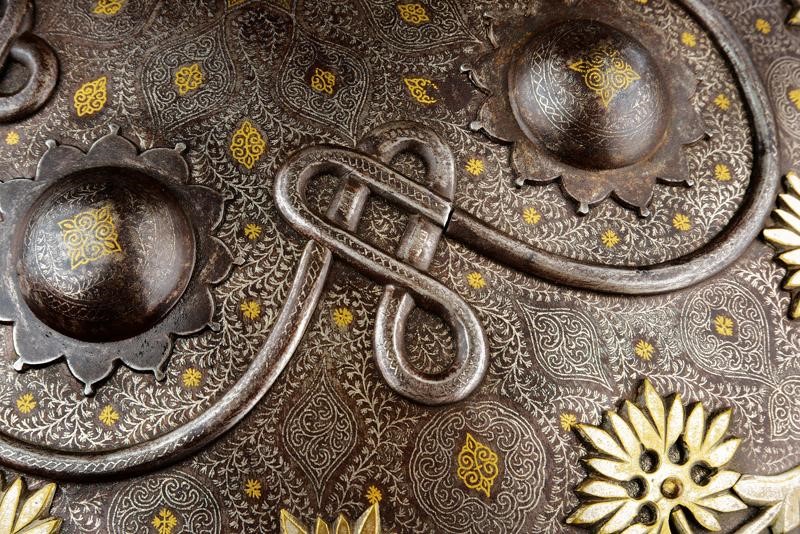 Made of iron, of convex circular shape, four studs provided with petals, reinforced and riveted border; the entire surface finely gold-and silver-inlaid with floral and geometric motifs; the rim decorated with a round of brass riveted decorations; the central part with interlaced bands with knots in relief. At the back four solid rings, missing handles.