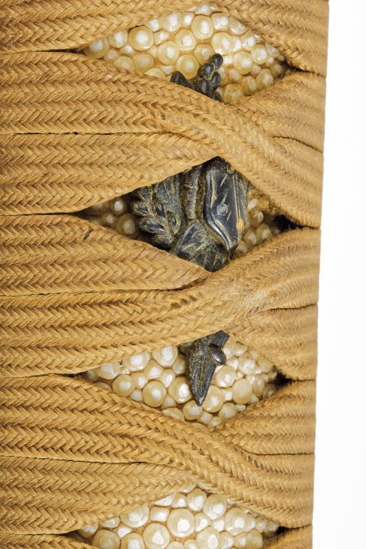 Made of wood wrapped in ray skin and tsuka-ito in morohineri-maki. Suaka (copper) Menuki decorated in gold and silver. Fuchi and kashira made of shibuichi with gold and silver inlays depicting Fukurokuju.