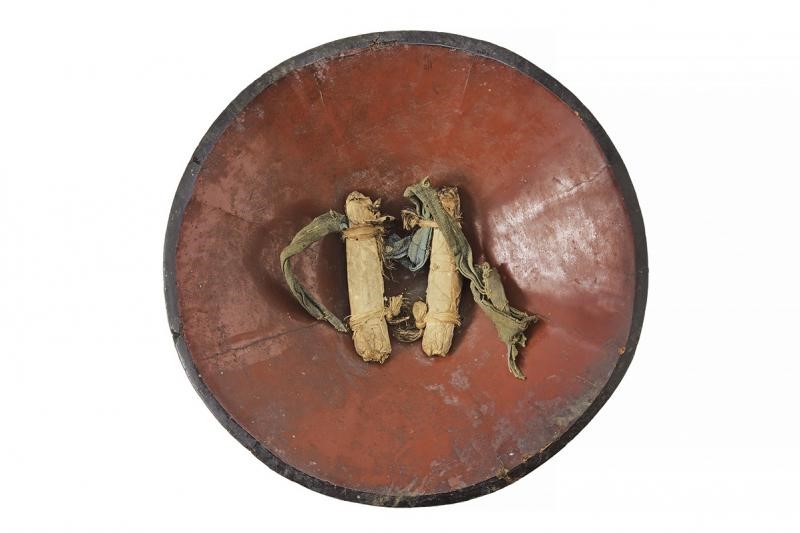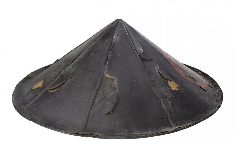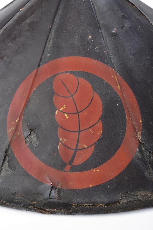 Of conical shape, consisting of eight iron plates and black-lacquered Urushi (missing parts), with red Maru-ni-Ichimai-imokashiwa-mon coat of arms at the front part. The inside part with red-lacquered finishing and complete with futon and laces. Used by Ashigaru Teppo-tai (musketeer).