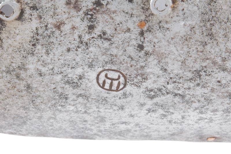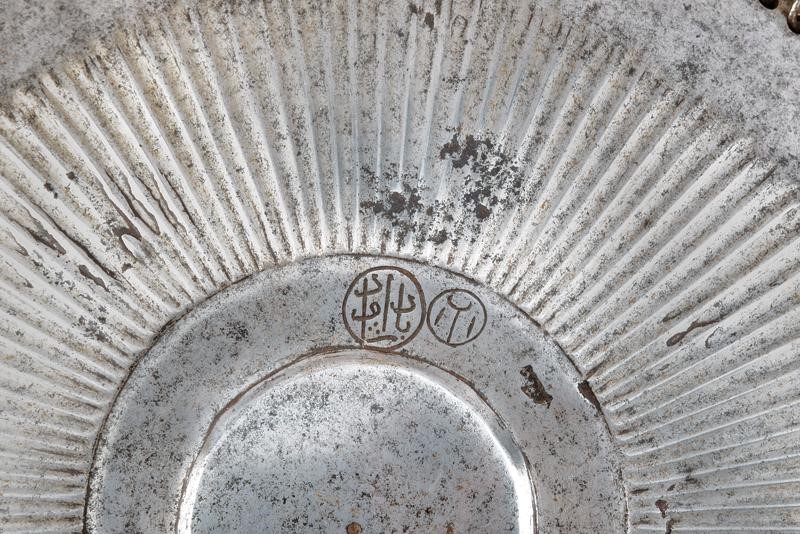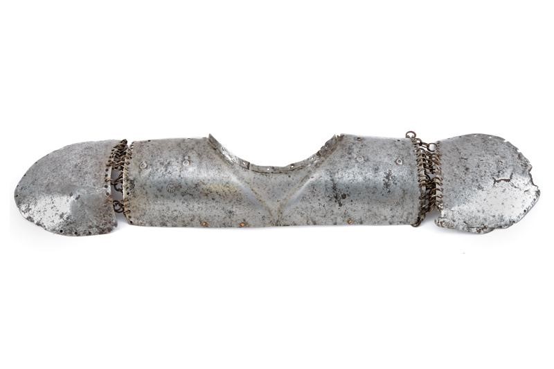 Central radial disc, raised in the centre, featuring the brand (tamga) of St. Irene's arsenal on the edge and a second cartouche with Arabic inscription; around it three iron plates (the upper one with old repair) held together with riveted iron rings (minor missing parts and defects). Together with the shoulder protection (size 33 x 12cm), also made of iron and marked with tamga, complete with the two side blades held together with rings (missing parts and defects).