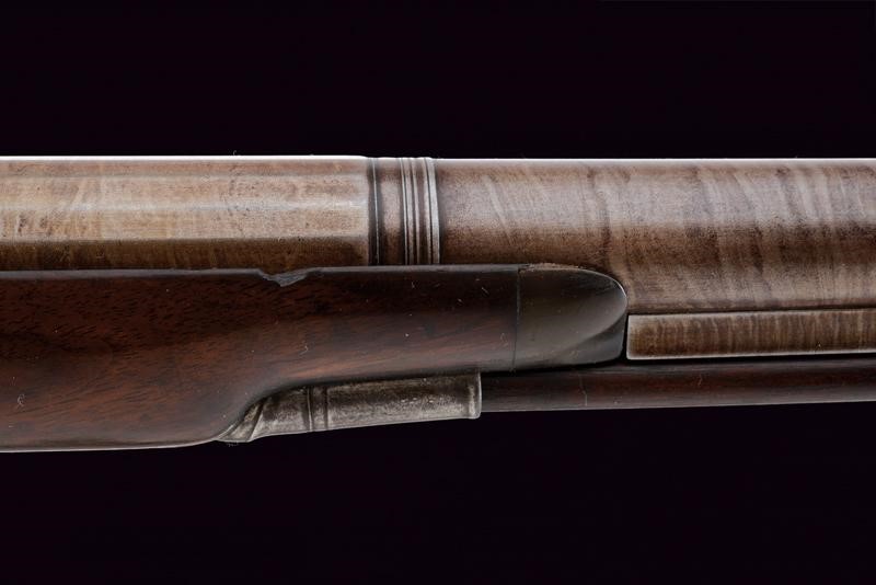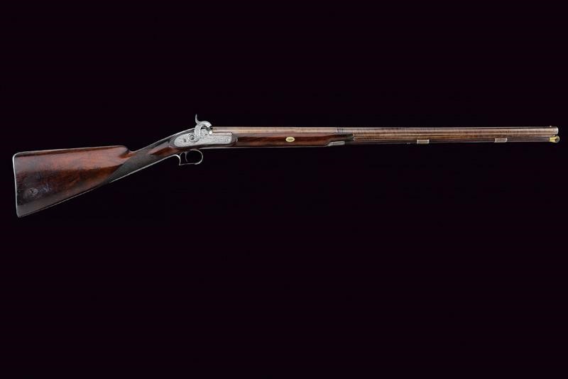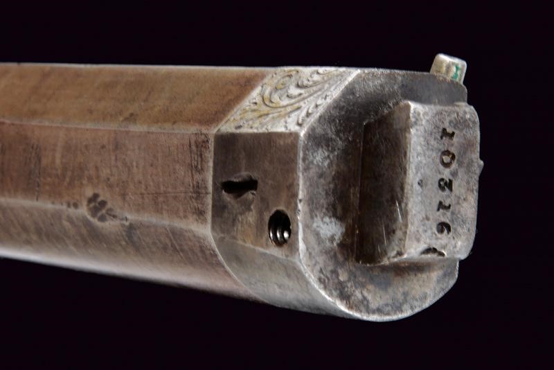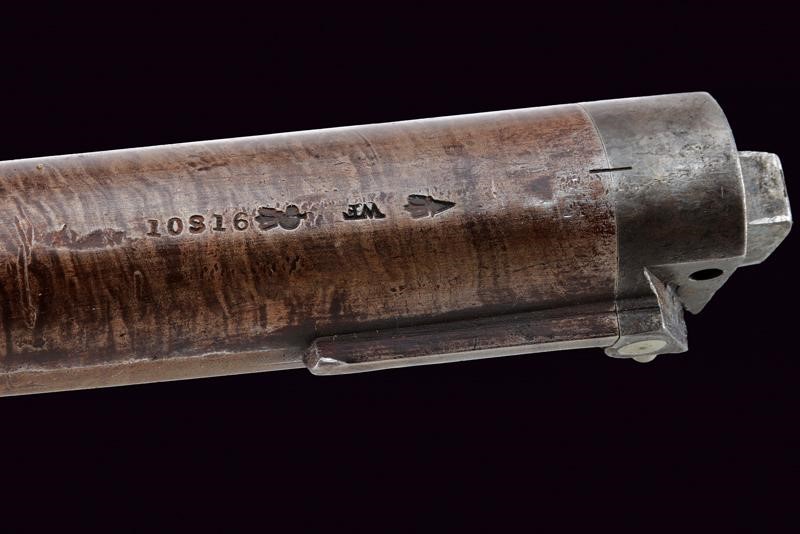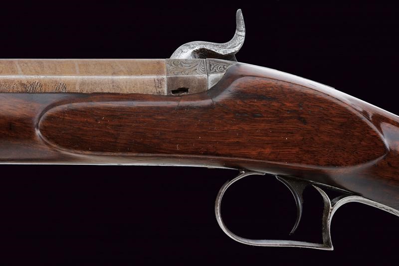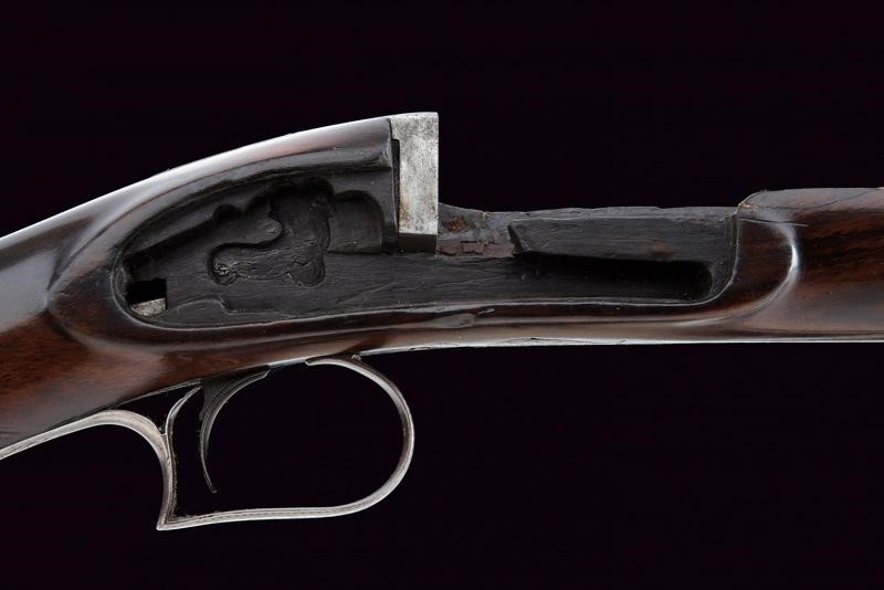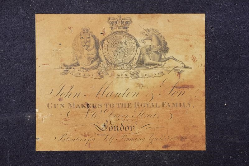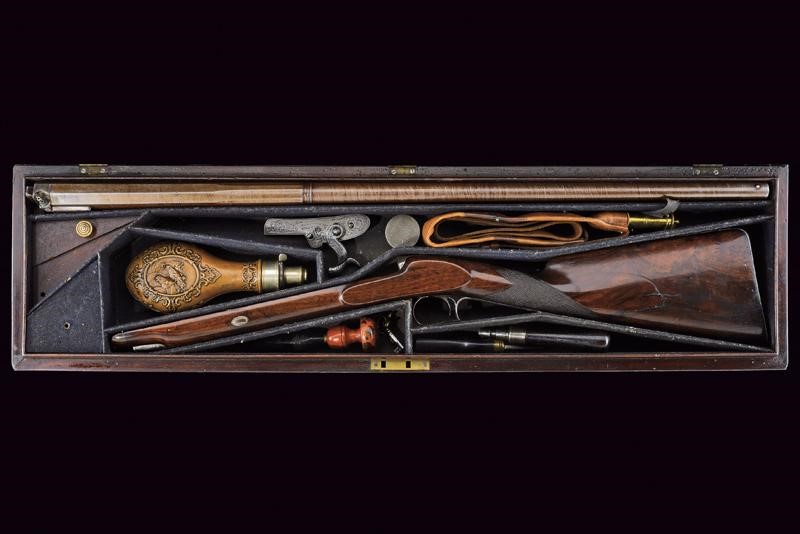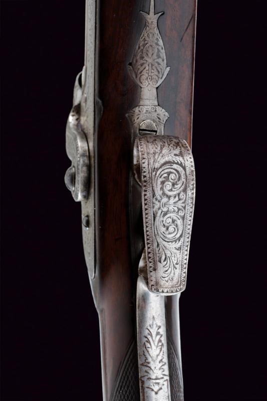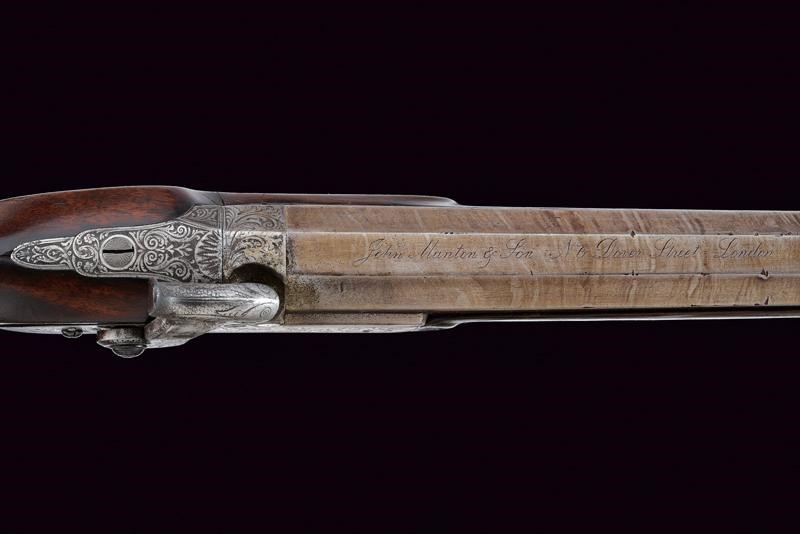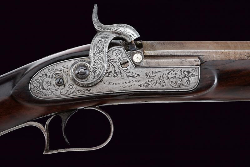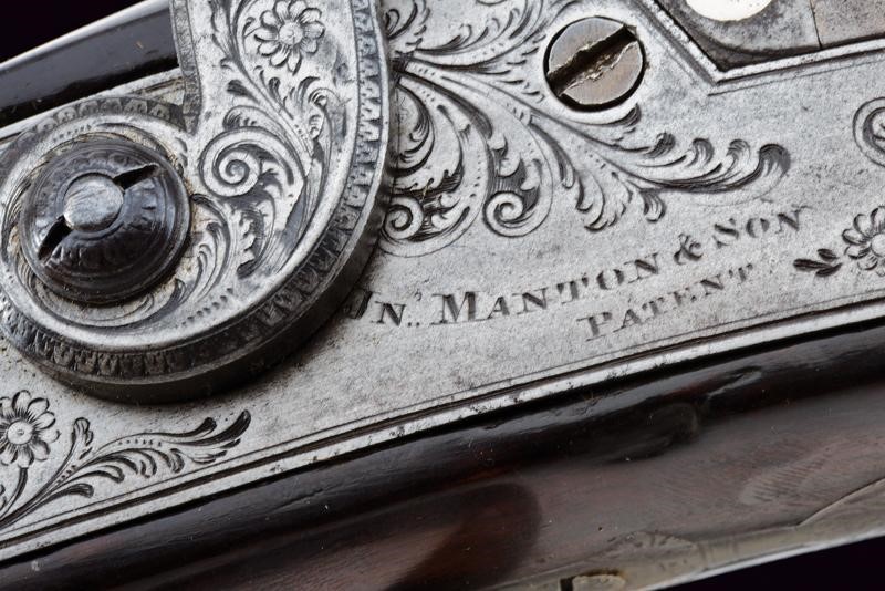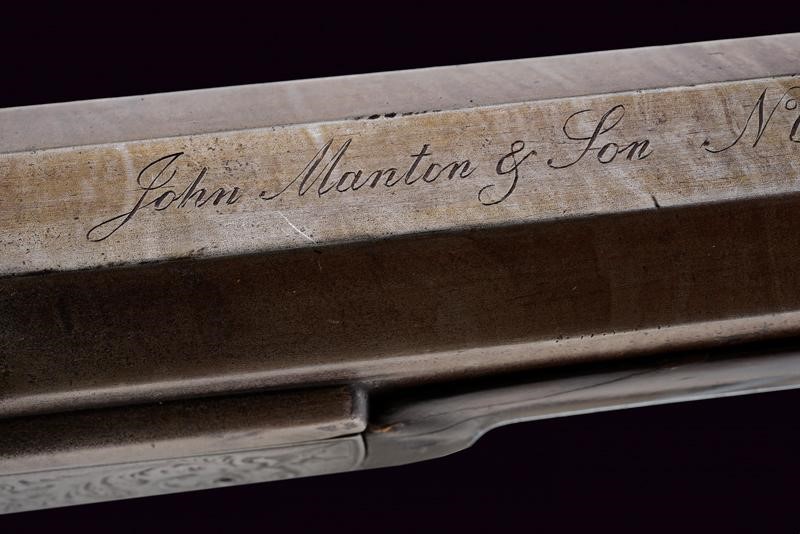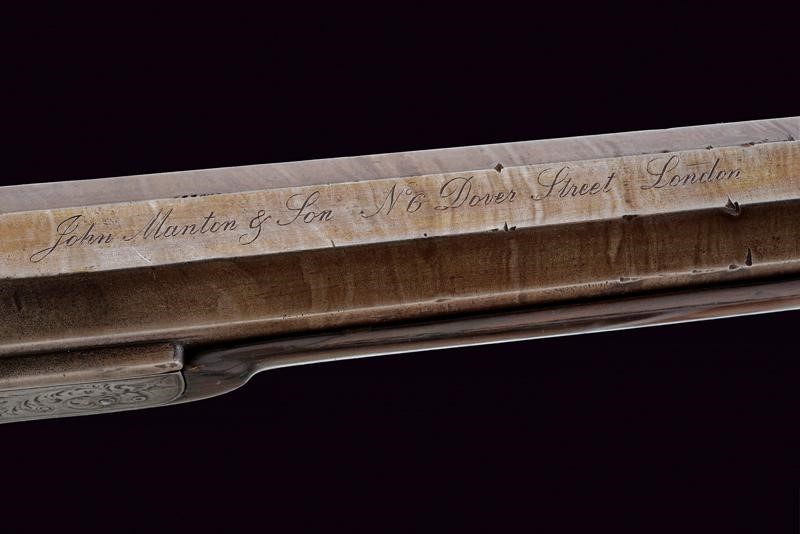 Smoothbore, three-stage, 17 mm cal. barrel with damscus design, octagonal at the first part and signed "John Manton & Sons No. 6 Dover Street - London"; then with a sixteen-side segment and of round section at the end, with rings at the last girdle; silver foresight. Finely engraved tang. Forward spring lock signed "JN MANTON & SONS PATENT", lock plates engraved with fine floral motifs and mystic animals. Wooden half stock with checkered grip. Iron mounts decorated en suite. Silver shield on the back. Brass-tipped, wooden ramrod and brass and iron cartridge extractors. Complete with its wooden box lined with dark blue cloth, Manton label, tools and accessories. Provided with key.
