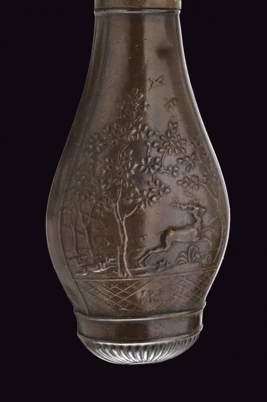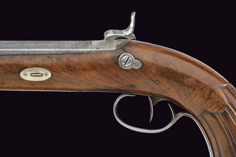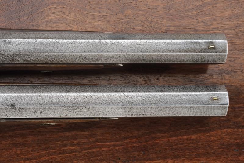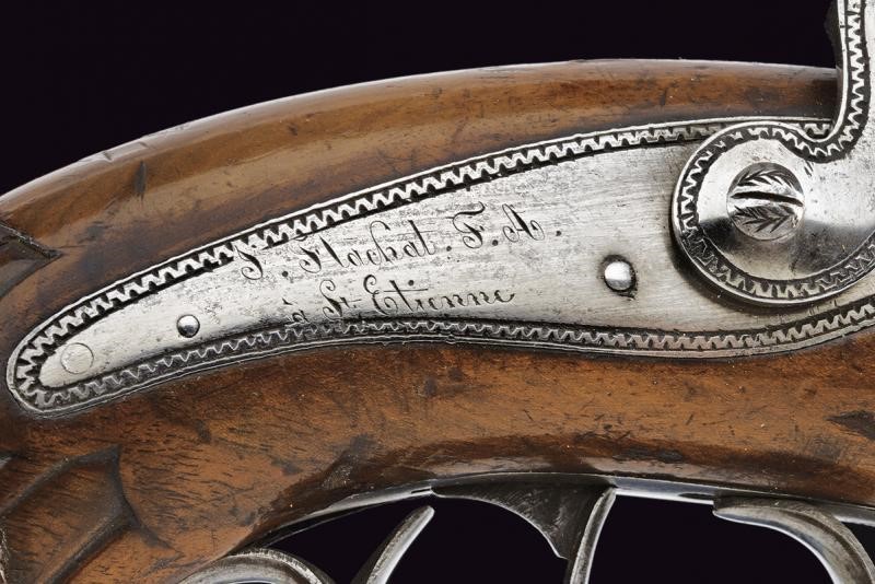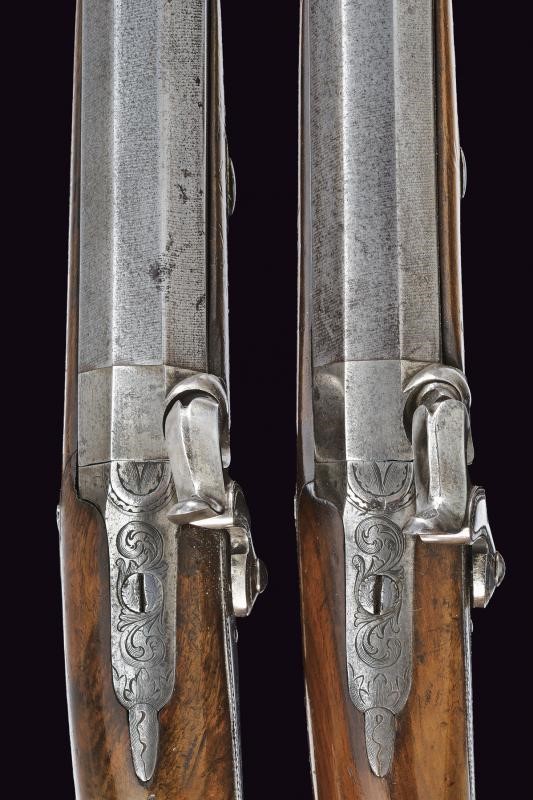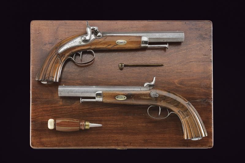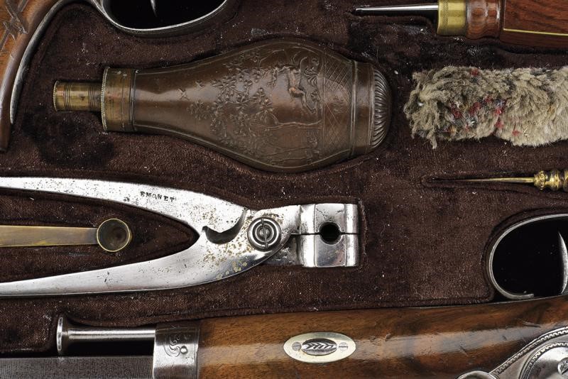 Smoothbore, octagonal, 18 mm cal. barrels of damask, with foresight. Engraved tangs. Backward spring locks with Flachat signature in St. Etienne and borders decorated with waves. Three-quarter wooden stocks with checkered and grooved butt. Steel mounts engraved en suite. Iron ramrods. In a wooden box lined with burgundy velvet, complete with all accessories and key.