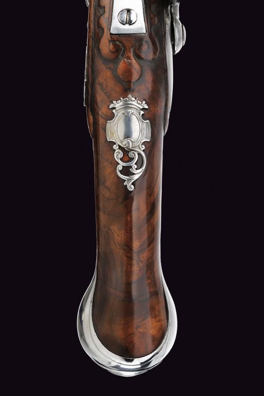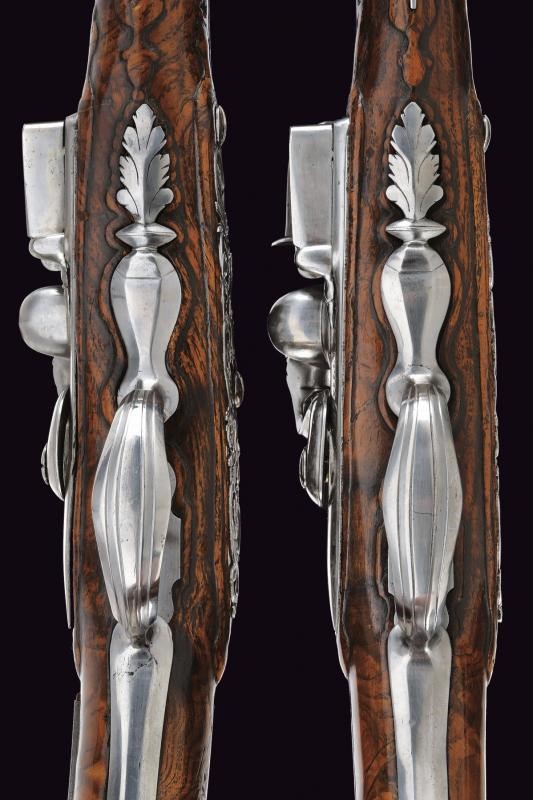 Smoothbore, 16 mm cal. barrels, square at the base with foresight and long rib. Smooth, trapezoidal tangs. Flintlocks with rounded lock plates signed "DEVILLERS". Fine full stocks of briarwood (some cracks and minor restorations). Steel mounts. The counterplates carved and pierced with floral motifs. Butt-plates with large mask. Faceted barrel brackets. Iron-tipped, wooden ramrods.