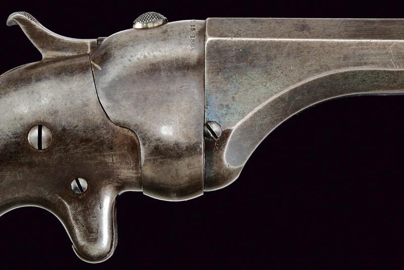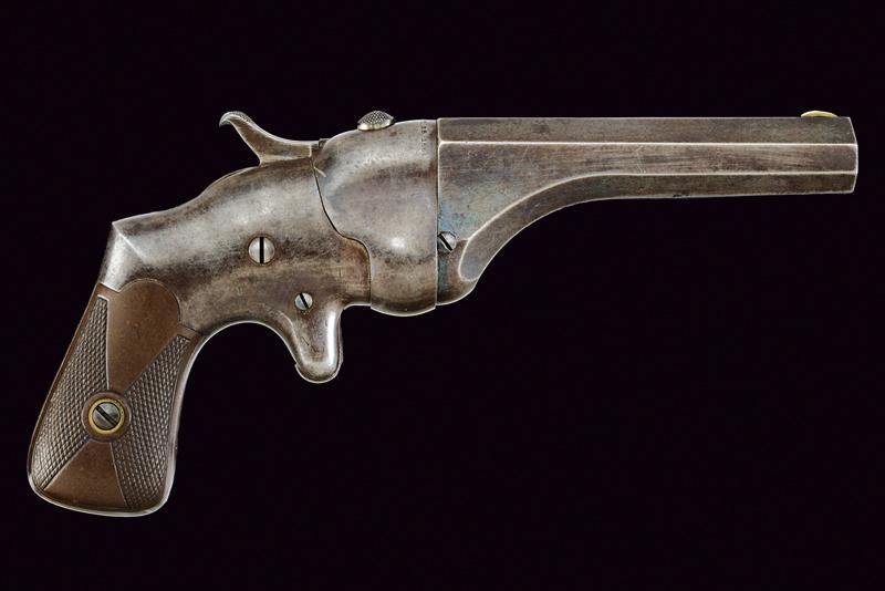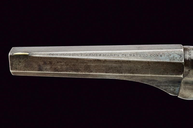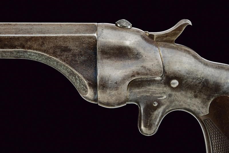 Faceted, rifled, 4", 44 cal. rimfire barrel (bore with slight signs of use and slight pitting, visible rifling). White metal foresight, mark “CONNTECTICUT ARMS & MANF'G Co. NAUBUC CONN”. Traces of antique bluing. Frame with lateral swivelling bolt, with patent 1864; spur trigger and back cock. Grip with checkered, brown grip scales. Serial number "31xx".