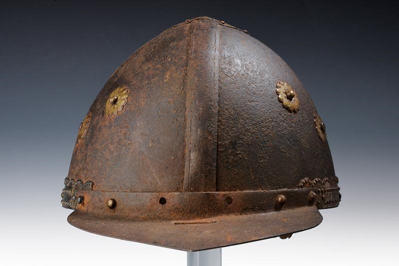 Iron skull provided with a reinforcing band, at the top a large brass plate shaped as a flower decorated with small circles, three brass rosettes on each side; with a brass band decorated en suite at the base. With a straight pointed brim and rectangular opening for the nosepiece (missing parts) at the front part. With loin-guards at the back, brass border toothed and decorated with small balls in relief. Rusty surface inside, remains of leather strings to fix the lining.