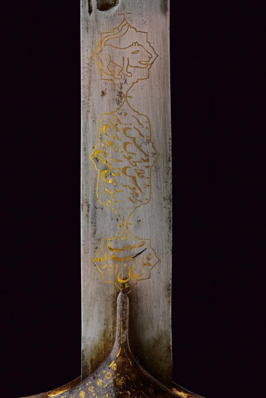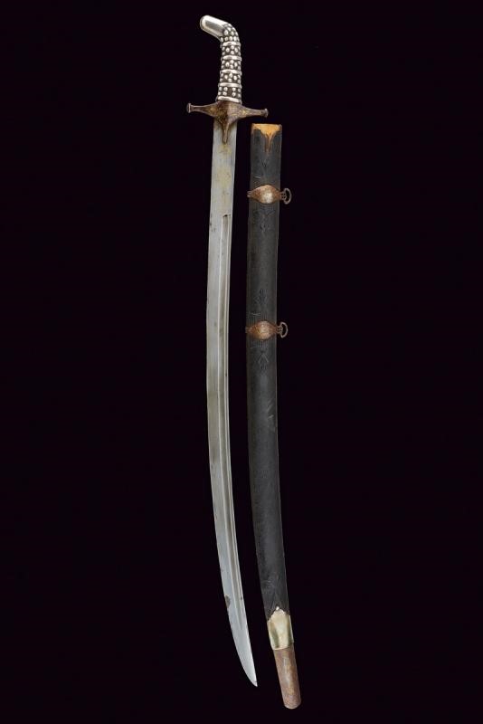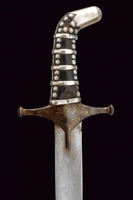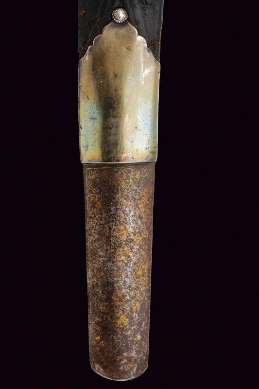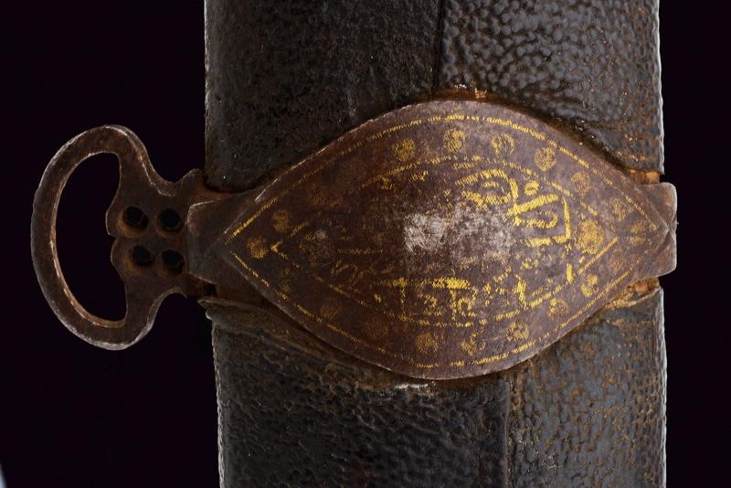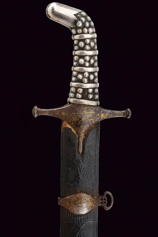 Slightly curved, single-and-false-edged blade, of damask (small areas damaged by rust), with fuller and groove on the back, three cartouches on the right side with gold-inlaid inscriptions in Arabic (small missing parts). Hilt with iron quillon, langets, quillons ending with convex discs and decorated with gold. Leather-covered wooden grip with angled pommel, decorated with bands, ray rivets and smooth, silver cap. Leather-covered wooden scabbard decorated in relief (missing parts), iron mounts decorated en suite with the quillon; on the tip there is a silver hilt riveted like the grip.