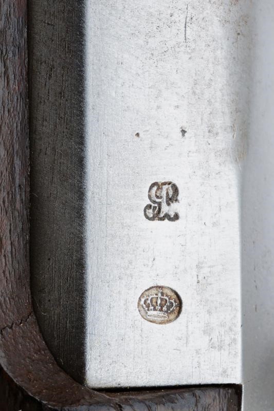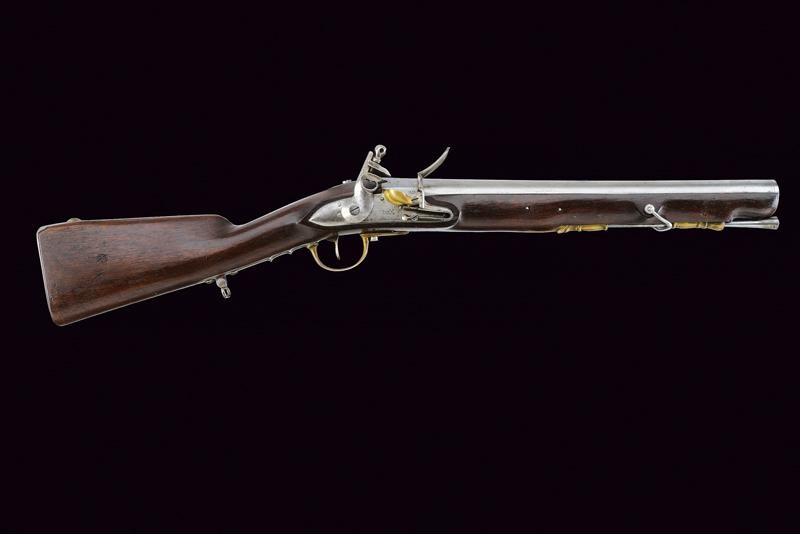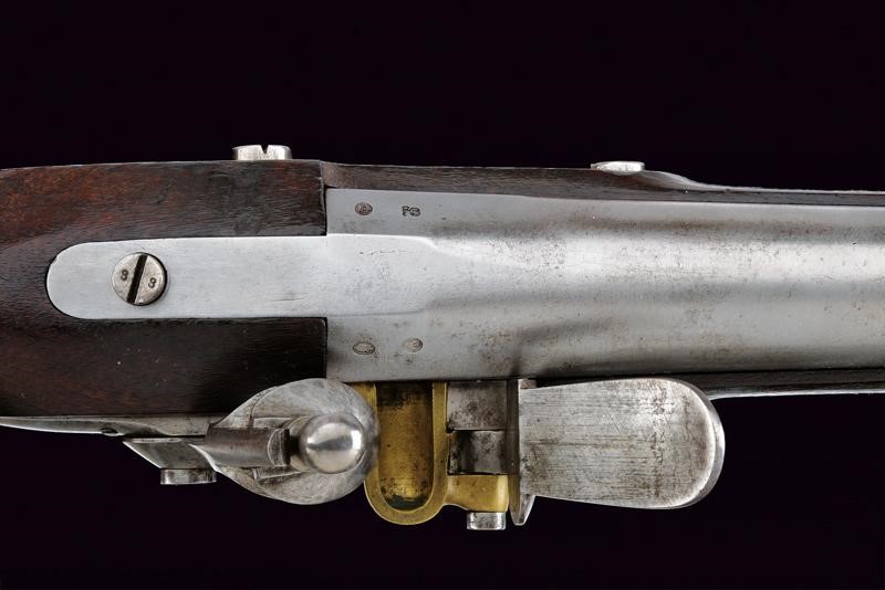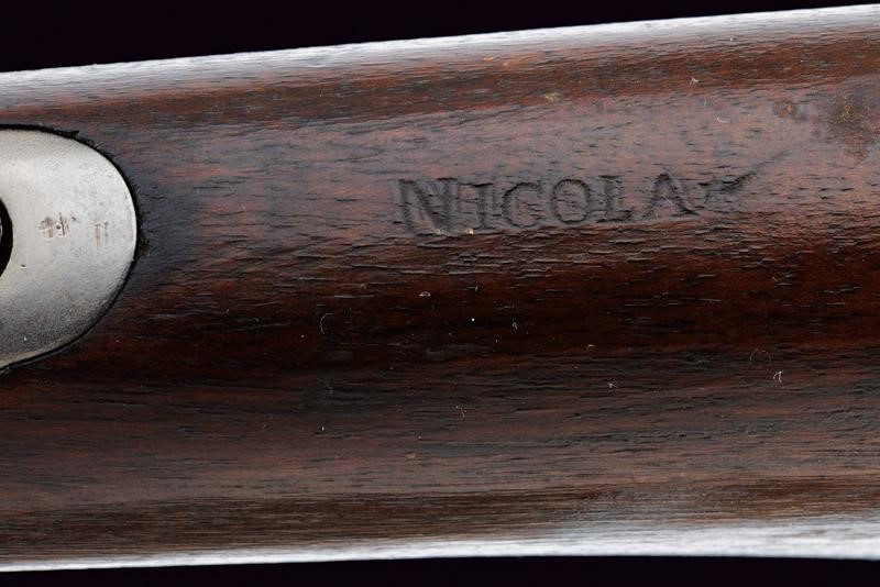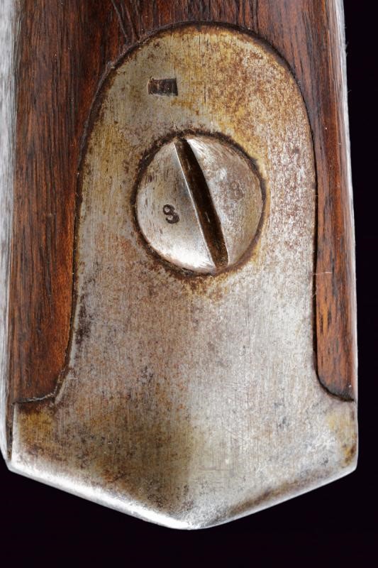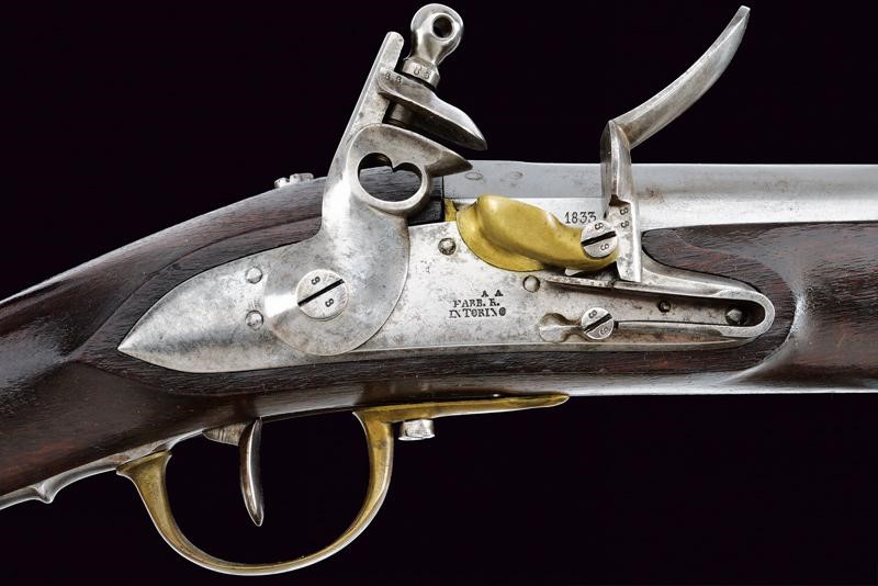 Heavy, smoothbore, round, 22 mm cal. barrel, octagonal at the base featuring Piedmontese marks and date "1833"; nozzle engraved with double ring. Lock marked "FABB.A R.A IN TORINO", brass pan. Wooden full stock with various stamps and "NICOLA" under the butt. Iron and brass mounts, various marks. Lock and all screws marked "88". Original iron ramrod with marks.