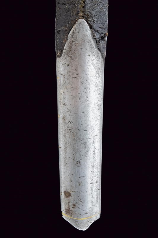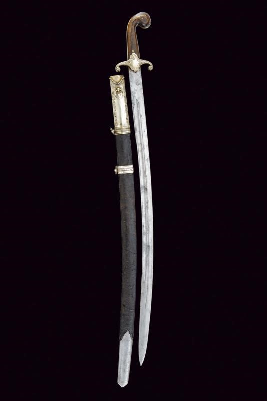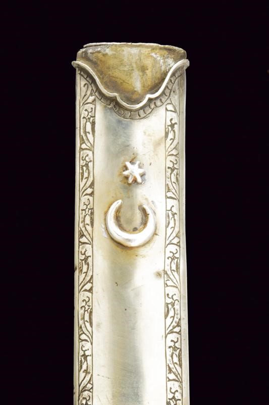 Single-edged, curved blade with fuller and double groove (one short and one longer). Hilt with engraved silver quillon, horn grip scales with angled pommel, metal band. Leather-covered wooden scabbard and silver mounts engraved with geometric motifs, the cap with crescent moon and star in relief.