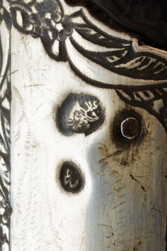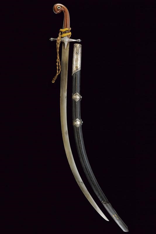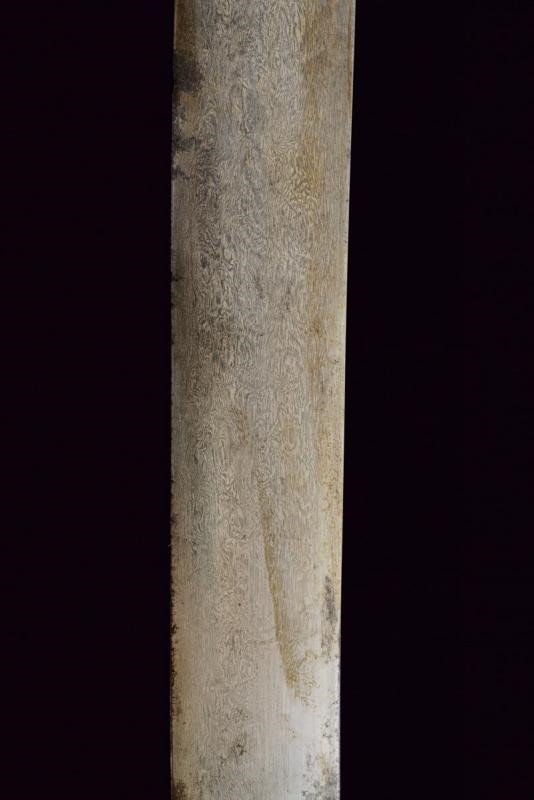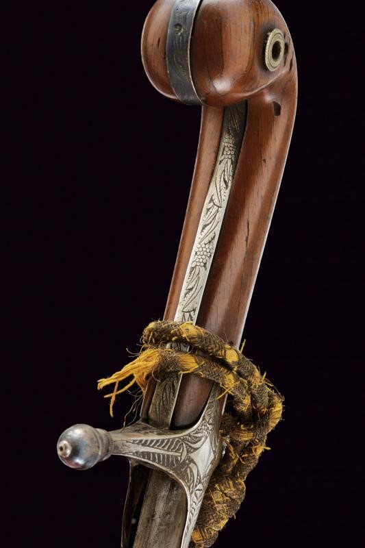 Flat, curved, single-edged blade, made of fine damask. Silver cross-shaped hilt finely engraved with floral and geometric motifs like the sash. Mark. Horn grip scales (small missing parts) with angled pommel. Wooden scabbard covered in leather with engraved and partially perforated silver mounts, various marks.