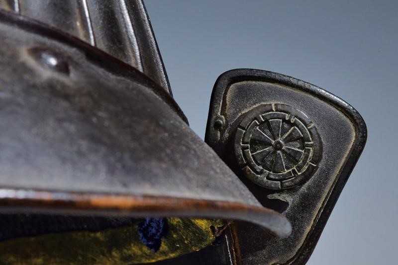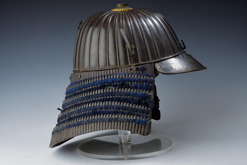 Hachi made of iron, with 32 black lacquered plates (small defects), tehen kanamono divided in gilded and browned copper sectors; browned Agemaki-no-kan, two tsunomoto on the sides (one missing) and one in the centre. Mabizashi with browned border. Five-blade shikoro with kon-ito-kebiki-odoshi lacing; small fukigaeshi (one missing) with browned metal mon. Inside, blue cap. Minor damage and general defects.