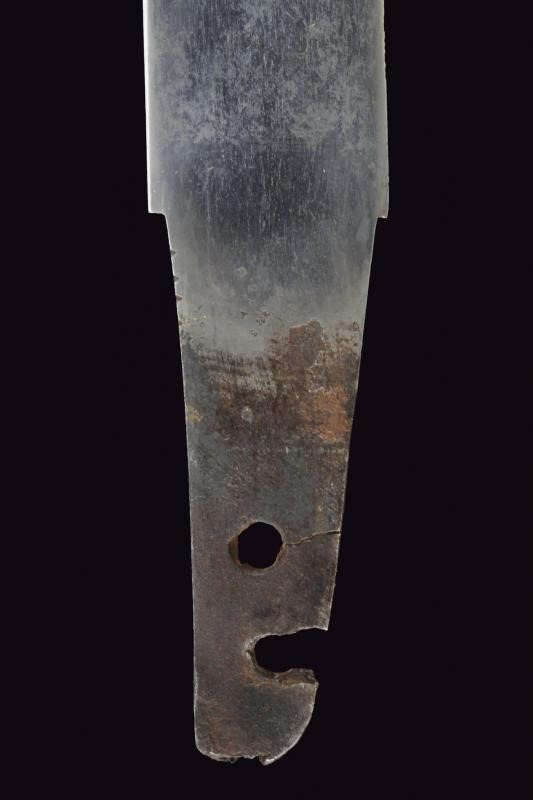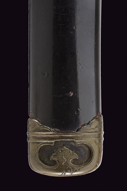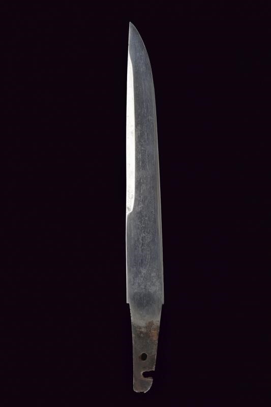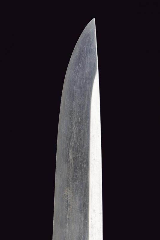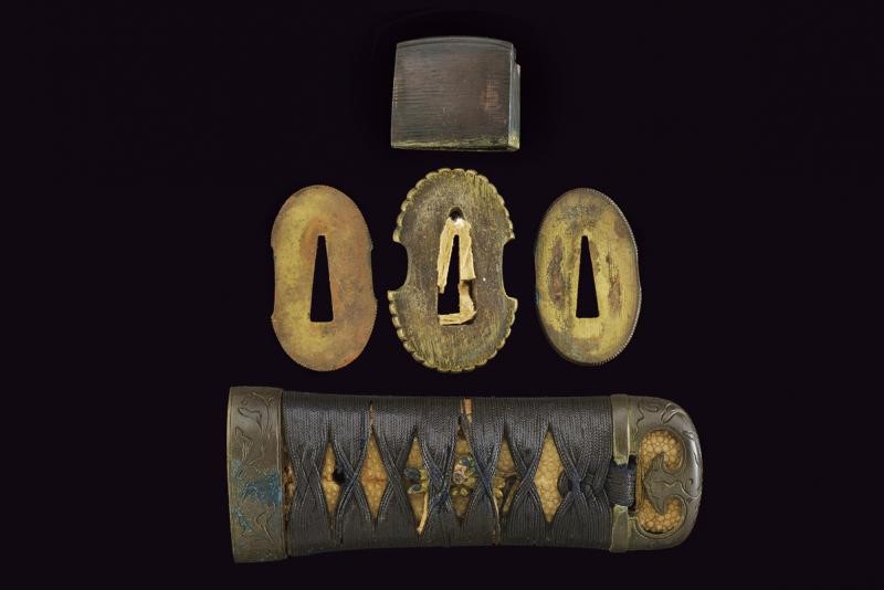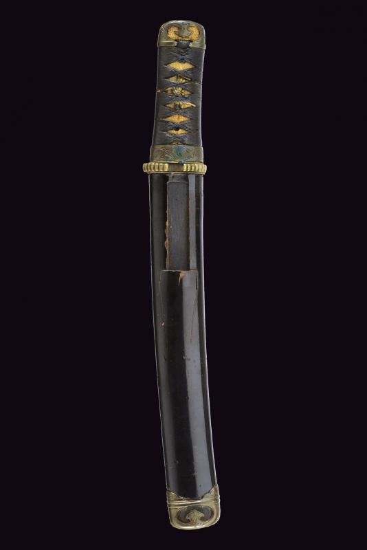 Unokubi-zukuri blade, iori-mune (nagasa: 19.2 cm), with traces of hamon and visible hada, small pitting on the back on one side, cleaning marks. Nakago mumei. Copper habaki. In 19th-century aikuchi mount with brass-coloured fuchi and kabutogane engraved with leaves and worked en suite. Menuki with traces of gilding (perhaps dragonflies?) Old tsuka-ito of black silk aiguillette (small damaged parts), ray skin same. Wooden saya with glossy black lacquer (finishing with small missing parts) and kojiri worked en suite with the grip mounts. Compartments for kogatana and kogai (missing).