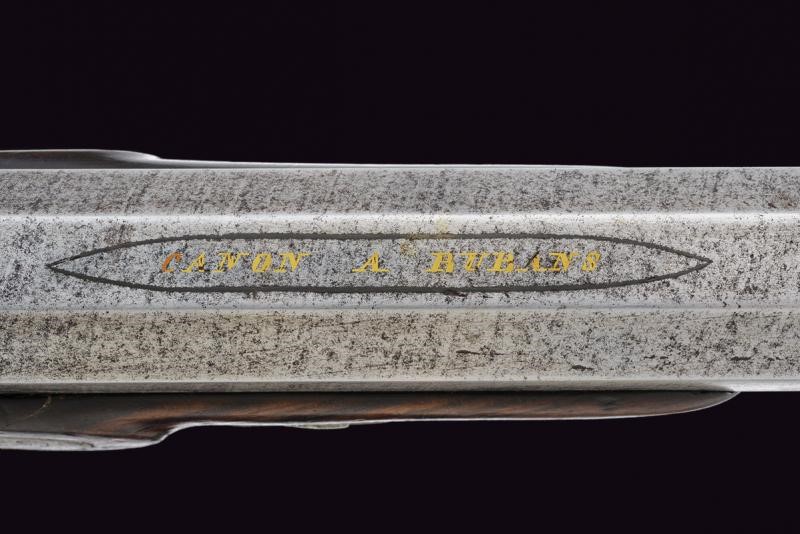 Octagonal, rifled, 12 mm cal. barrel (clean bore, visible rifling), engraved with floral motifs at the base and marked "CANON A RUBANS" in gold, on the left side mark of the Liegi test bench. Tang engraved and provided with rear sight. Forward spring lock decorated en suite. Wooden half stock sculpted at the fore-end cap and grooved at the butt. Yellow metal mounts engraved with floral motifs; trigger guards with finger supports. The set trigger needs to be fixed. For a case, therefore without ramrod.