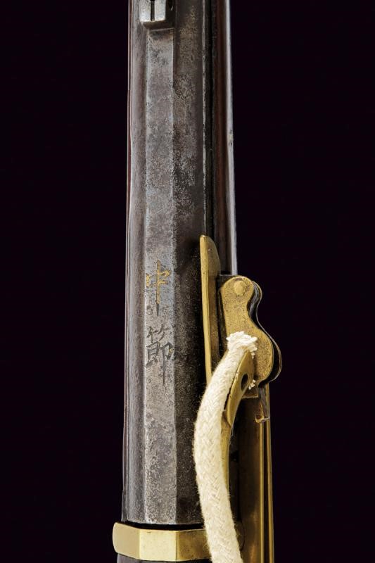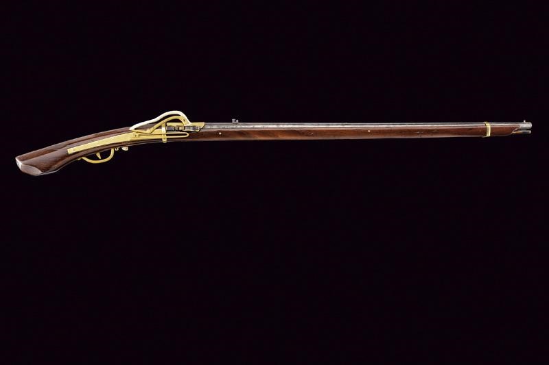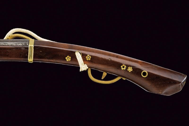 Octagonal, smoothbore, 15 mm cal. barrel, side ribs, with signature at the base featuring remains of gilding; then remains of engraved floral motifs; fixed rear sight and foresight. Brass lock and mounts. Wooden stock. Working mechanism.