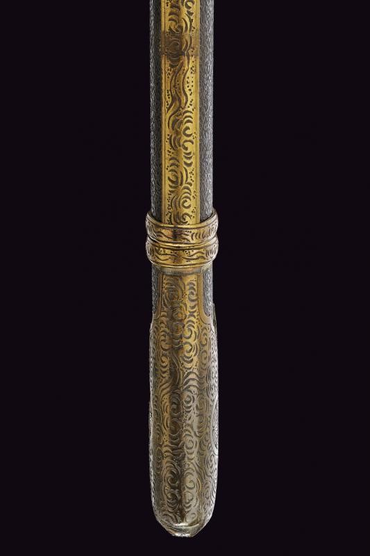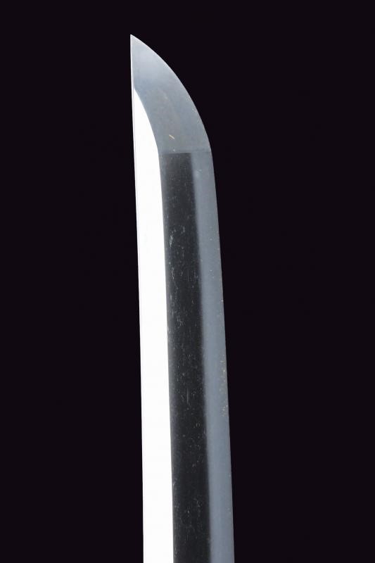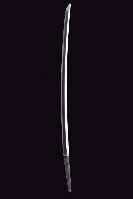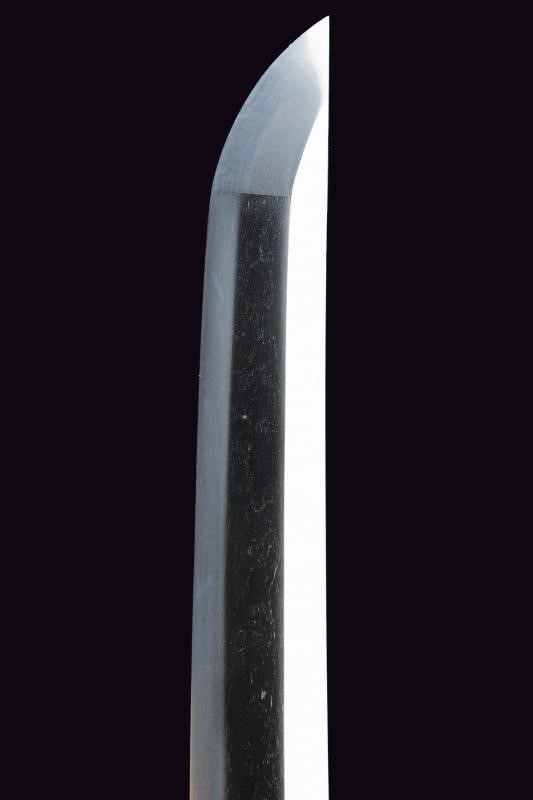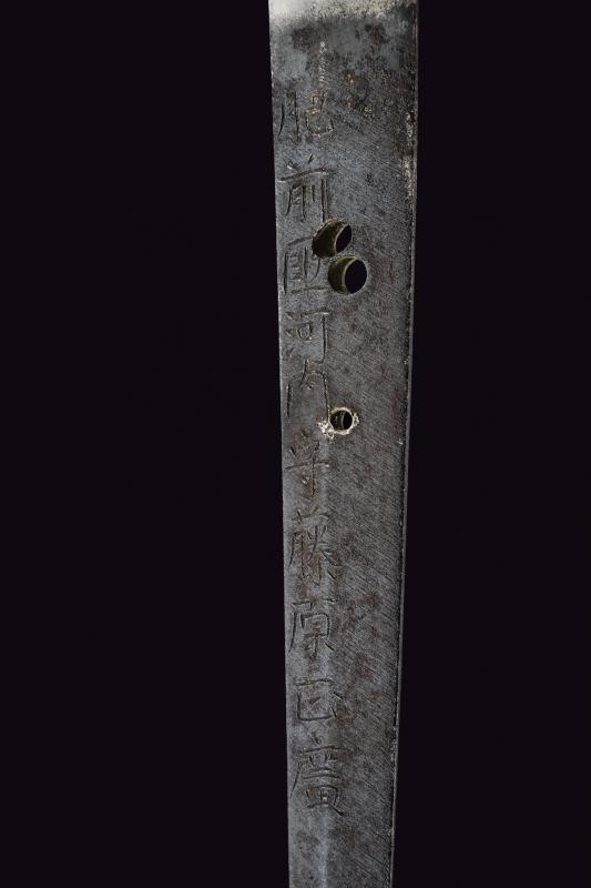 Blade (nagasa length 71 cm); Hirazukuri Iori Mune; Hada: Itame Mokume; Hamon: Sugha Nie Deki. Habaki engraved with mon of the Togugawa family. Nagago Ubu Hiriyama Gata, mei (ghimei) Hizen Kuni Karachi no Kami Fujiwara Masahiro. Koshirae with bronze mounts engraved with waves and almost all the elements have the same mon as the habaki. Long grip covered in golden ray skin and provided with long, dragon-shaped menuki. Saya made of smooth, lacquered wood at the top and granulated later, complete with all mounts (a mon is missing on one of the two ashima).
