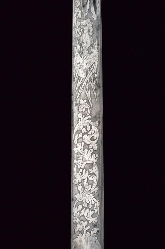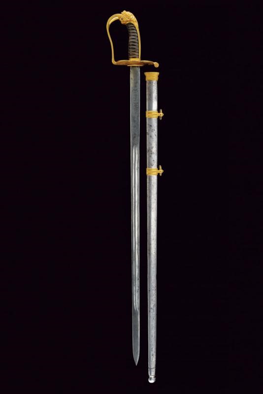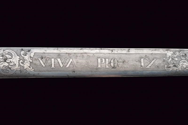Straight, single-and-false-edged blade, first flat then with double groove, the flat part finely engraved with trophies, floral motifs and the motto "VIVA PIO IX". Gilt bronze hilt, semi-elliptical rain guard with line on the border, guard carved with floral motifs, long cap shaped as a lion's head. Horn grip (small missing parts) with metal wire binding. Iron scabbard with two lugs, gilded bronze mounts.