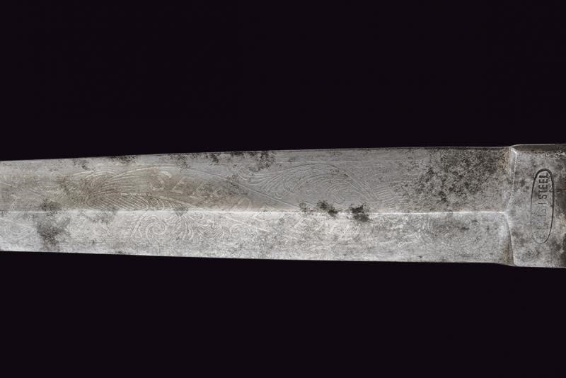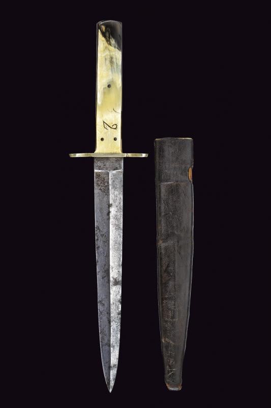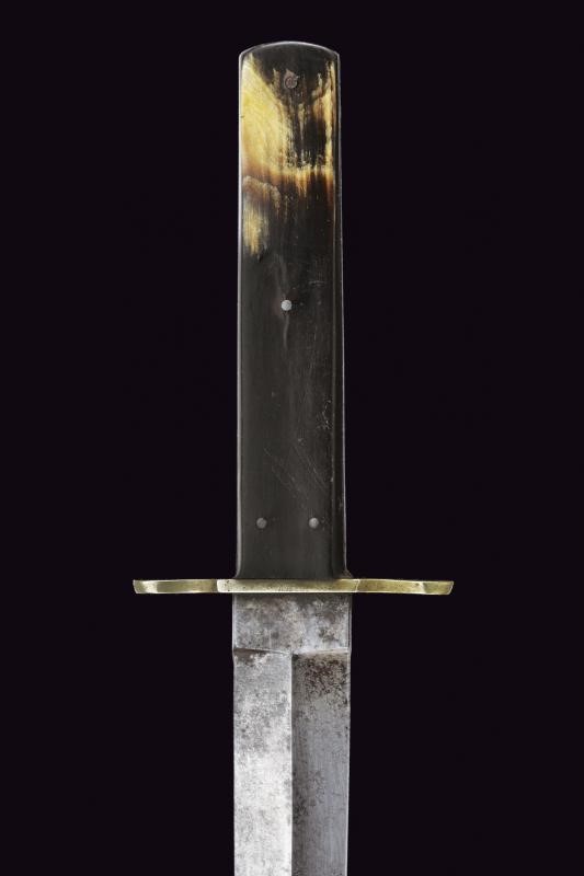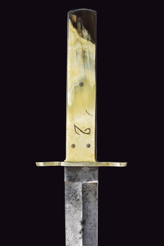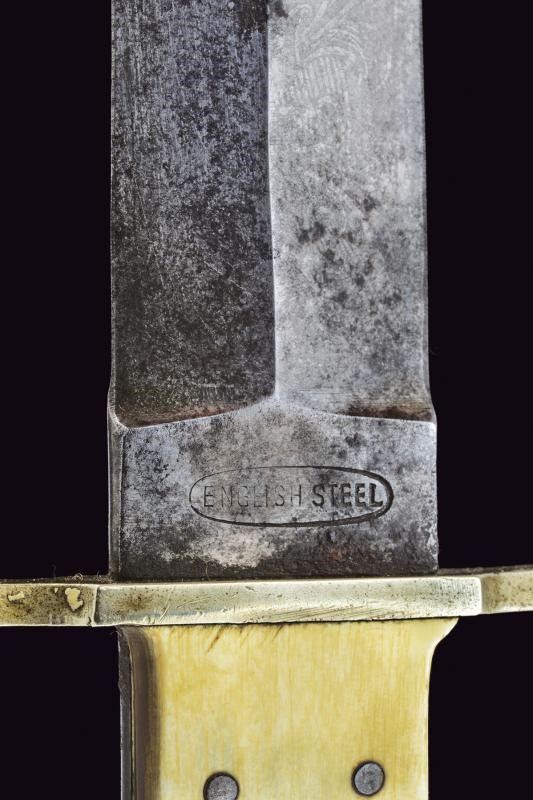 Straight, double-edged blade, ribbed in the middle. On one side remains of raceme engraving and cartouche "THE PATEN... / SELF DEFENDER". Tang marked "ENGLISH STEE"’. White metal crossbar. Grip with cowhorn grip scales. Leather scabbard with white metal mounts and protective leather sheath. Probably made on site from imported steel. Uncommon type.