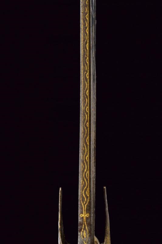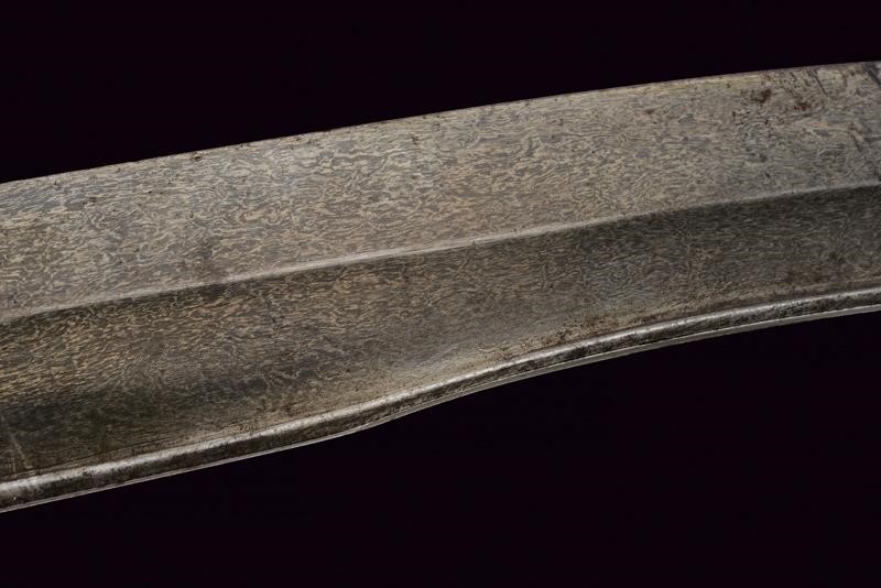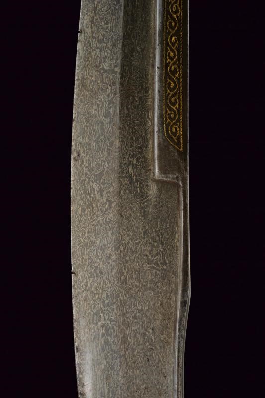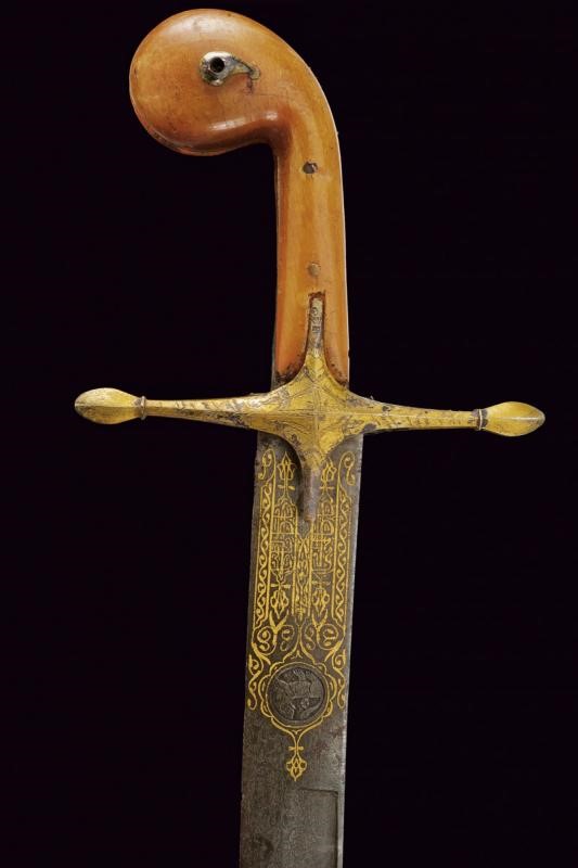 Wide, curved, single-and-false-edged blade of fine wootz damask, some pitting on the edge, with gold inscriptions at the base and decorations on both sides, on the right side featuring a lion within a circle, on the opposite side a cartouche with inscriptions. Silver cross-hilt with remains of gilding and engraved elements, provided with two marks (probably of Mamluk origin). Horn grip scales (missing parts) with angled pommel, gilded metal band engraved with wave motifs.