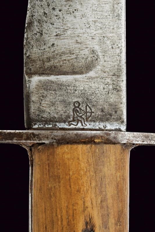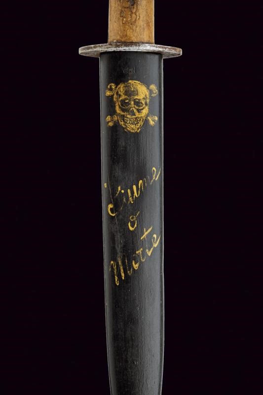 An Austrian combat dagger, First World War era. With blade featuring signs of use and time, marked at the tang with an effigy of an archer. Typical flat iron quillon and grip with wooden grip scales. Austrian regulatory scabbard, made of iron, marked "V&N" and with double loop at the rear side. The dagger scabbard has been dyed black, on the front face a skull with crossed shinbones surmounted by the typical motto "Fiume o Morte" painted in gold.