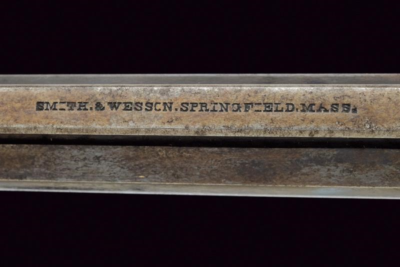 Rifled, octagonal, 6", 32 cal. rimfire long barrel, semi-circular white metal foresight on the rib, marked “SMITH & WESSON SPRINGFIELD MASS.” Smooth, six-shot cylinder with clearly legible patent markings (up to 1860). Barrel swivelling upwards. Frame with 70% of the earlier blueing. Spur trigger. Serial number "27xxx". Rosewood grip scales, the right one with matching serial number. Working mechanism. Components with matching assembly numbers.