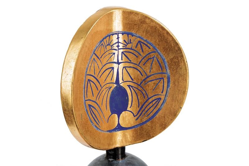 Made of black-lacquered and gilded wood. The upper element featuring three concave sides decorated with the mon "Daki-Myouga". The centralpart of spheroidal shape is metal-grey. The lower bowl-shaped element is made of gilded wood, decorated with an embossed wave motif with the "Itchin" technique and decorated with 10 scarlet Baren (tassels).