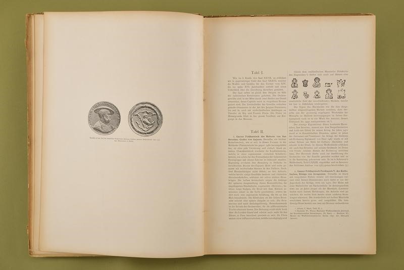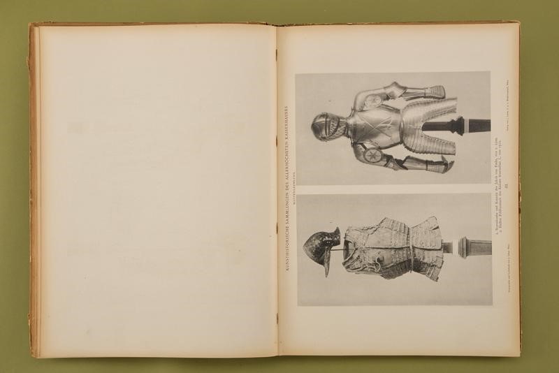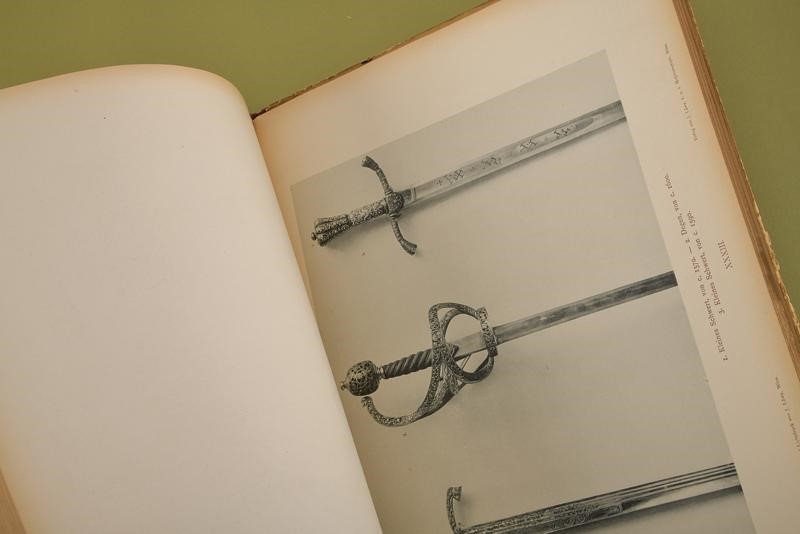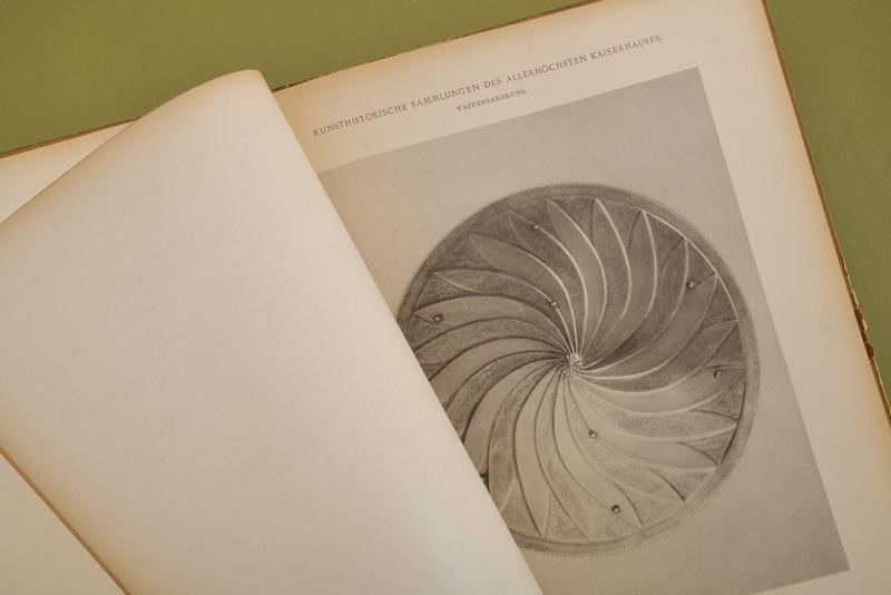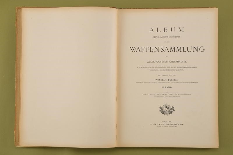 "Album hervorragender Gegenstände aus der Waffensammlung des Allerhöchsten Kaiserhauses"; Vol. II; J. Löwy, k.u.k. Hofphotograph, Wien, 1898; 18 pages of German text and 50 b/w plates. First page with ex libris "Robert Coltman Clephan" and "William Reid". Hardcover (defects and missing parts) with leather spine, titled in gold.