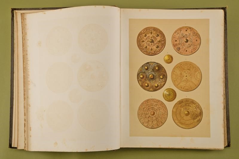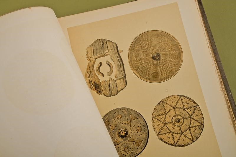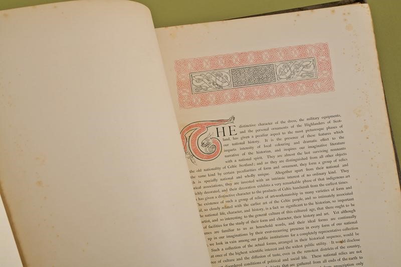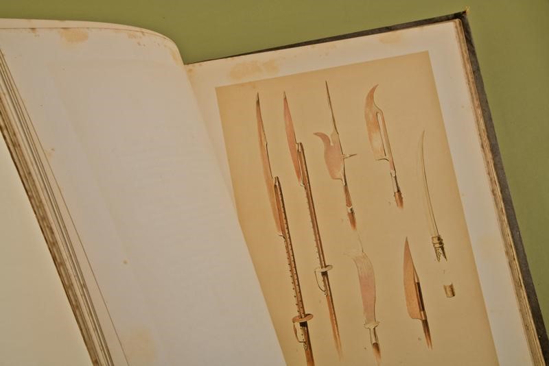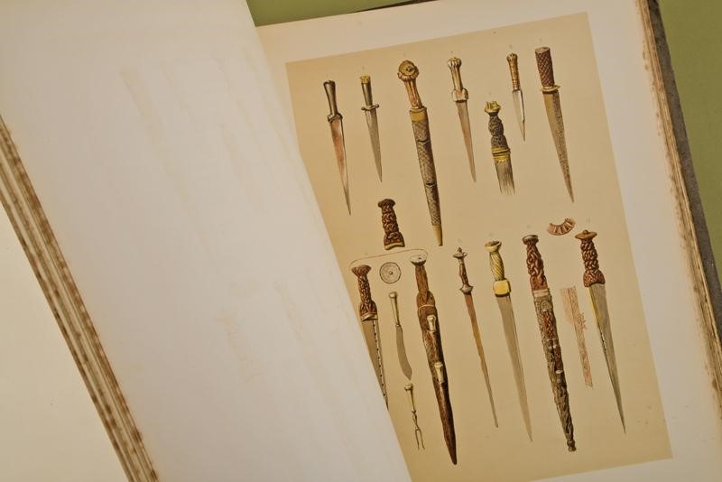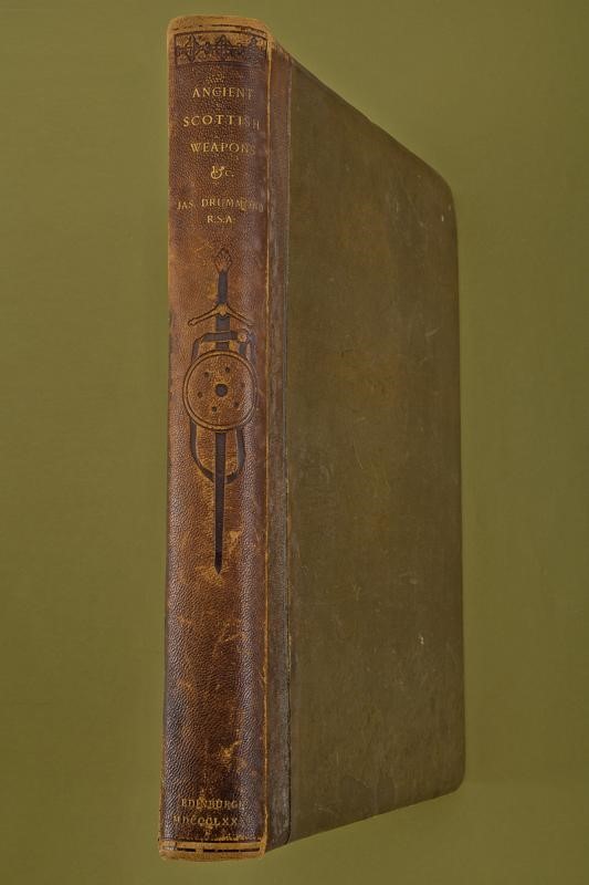 "Ancient Scottish Weapons"; George Waterson & Sons Edimburgh & London, 1881. Copy No. 154 of 500 copies for sale. 26 introduction pages, with text in English. 54 plates with colour drawings depicting weapons, musical instruments and other objects. Canvas hardcover with leather spine (defects) with imprinted trophy and gilt lettering. Yellowed pages. Rare.