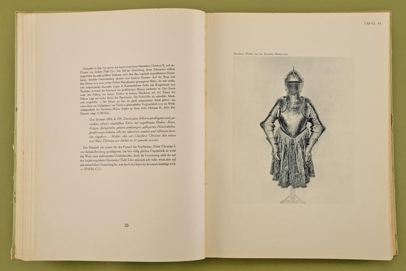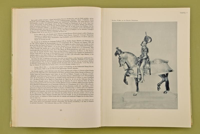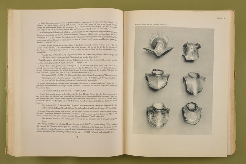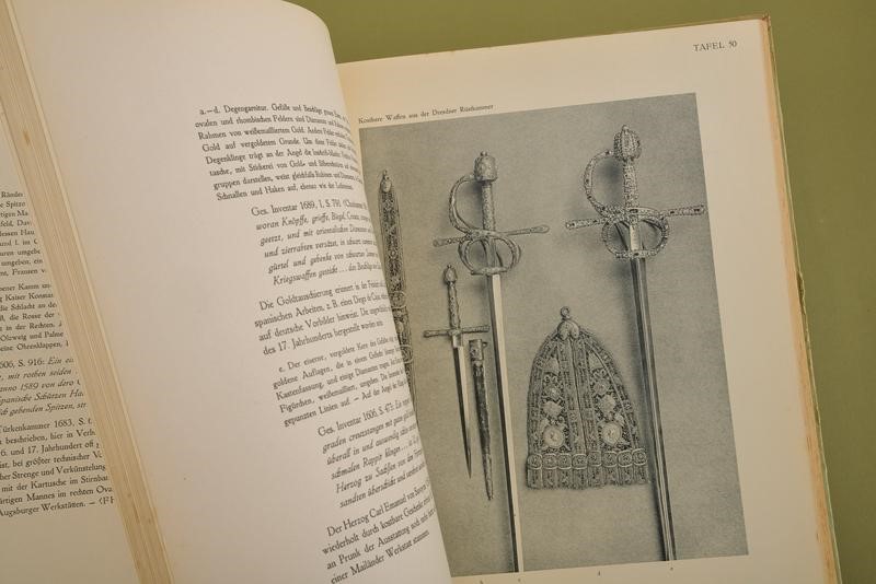 "Kostbare Waffen aus der Dresdner Rüstkammer"; Verlag Karl W. Hiersemann. Leipzig 1923. 167 pages, German text with 80 plates with b/w photos of armour and parts thereof, swords and other cold steels, harnesses etc. Hardcover (defects), with spine featuring label (almost detached) marked "HAENEL / KOSTBARE WAFFEN". On the inside cover label "THE WALLACE COLLECTION LIBRARY" and with pen writing "From the library of Claude Blair", together with a note "EX LIBRIS CLAUDE BLAIRE".