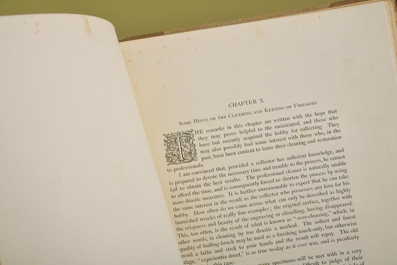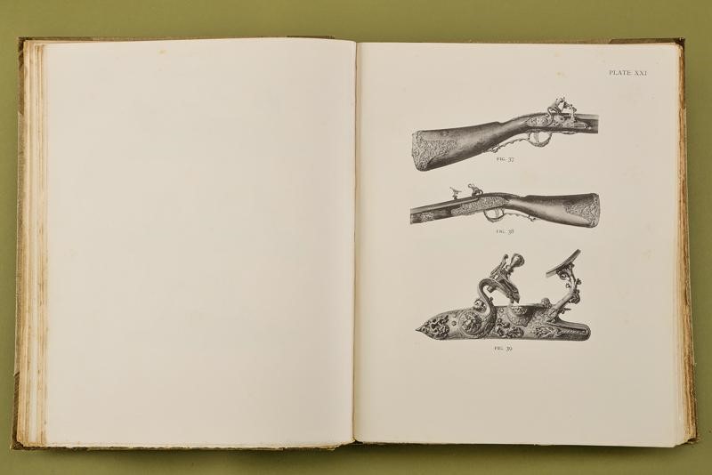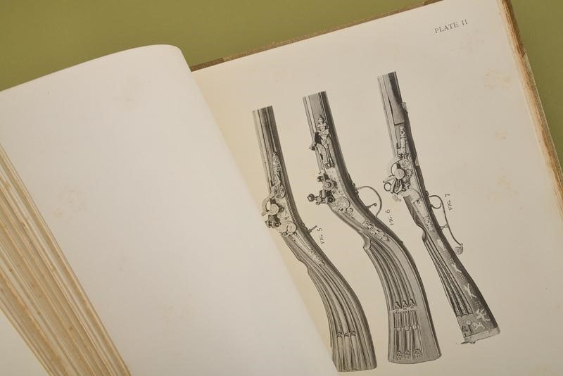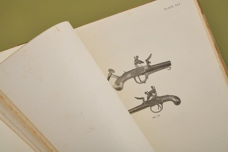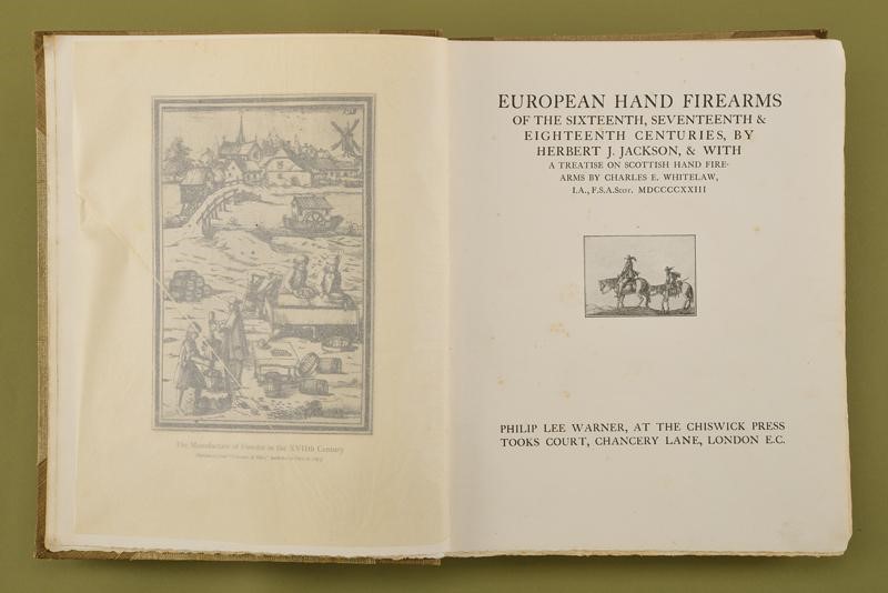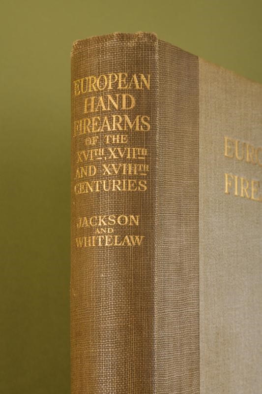 “European Hand firearms of the Sixteenth, Seventeenth & Eighteenth Centuries, by Herbert J. Jackson & with a treatise on Scottish Hand Fire-Arms by Charles E. Withelaw”; Philip Lee Warner, at the Chiswick Press Took Court Chancery Lane London, 1923. Edition of only 500 numbered copies (no. 111); 108 pages, English text, 71 plates with b/w photographs. Clothbound hardcover with title in gold. Rare.