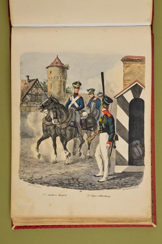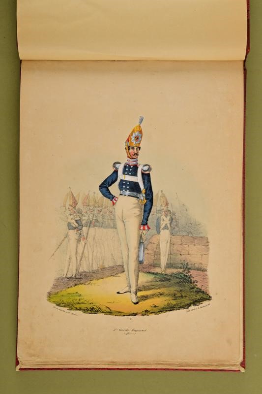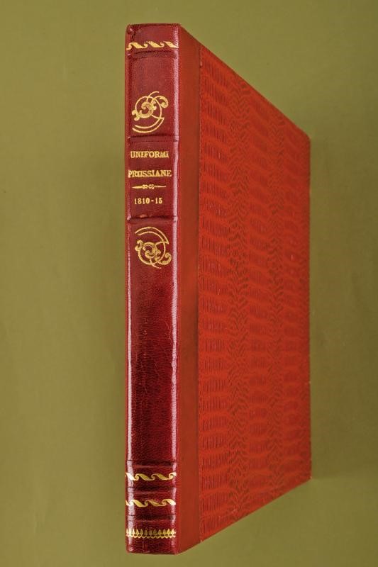 Interesting book containing sixty-seven watercolour lithographs of Prussian uniforms (originally seventy-two, five missing: 17-37-45-68-69). Each lithograph is numbered, signed by the author and with the regiment name. Bound in leather hardcover book; spine with "UNIFORMI PRUSSIANE 1810-15" in gold. Very well made.