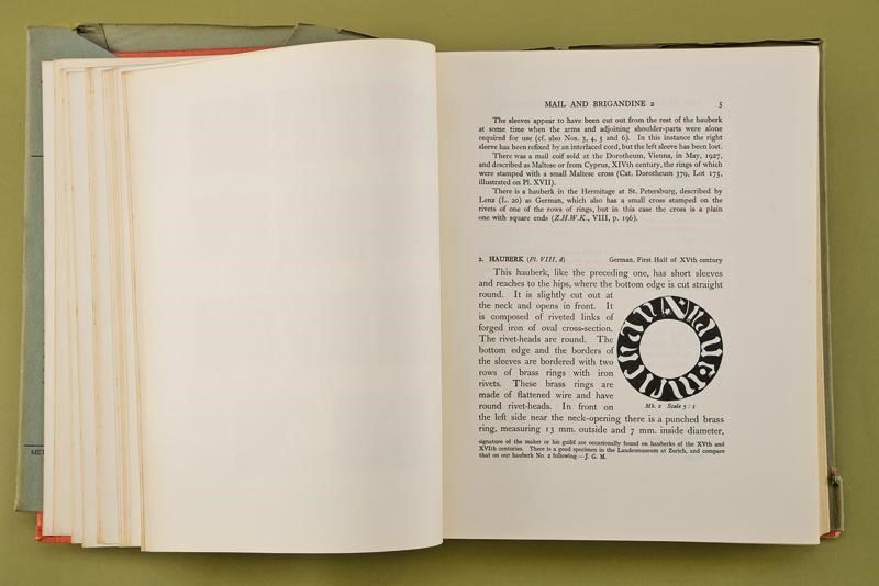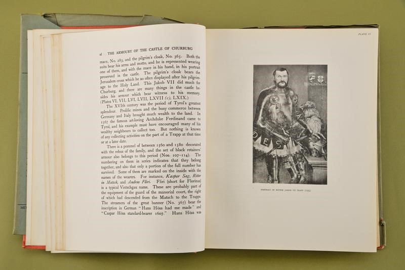 "The Armoury of the Castle of Churburg" Methuen & Co. Ltd; first English edition 1929, GB; copy number 32 of 400 numbered. 324 pages, English text, with 72 plates with b/w photos and numerous diagrams. Collection catalogue. Red cloth hardcover with gold imprints. Original dust jacket with minor damage. Very rare.