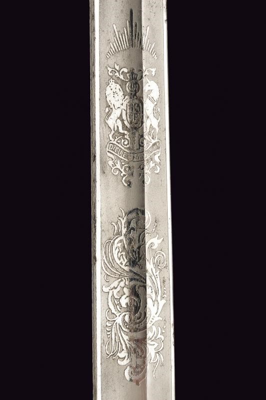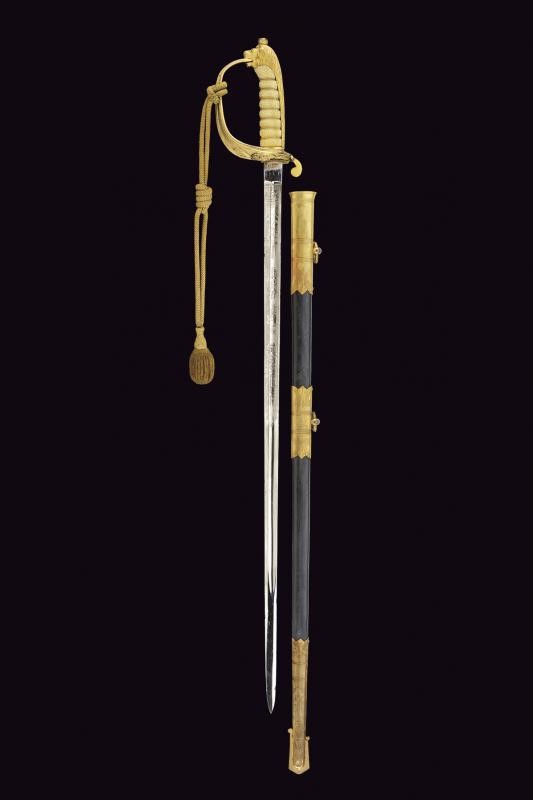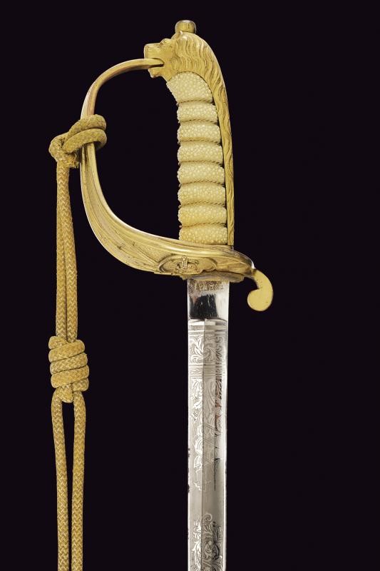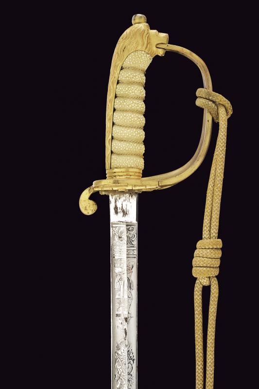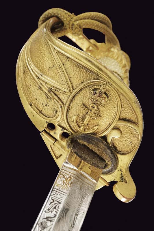 Naval officer's sword. Straight, nickel-plated, single-and-false-edged blade, with central fuller, the first part richly engraved with anchor, sailing ship, English coat of arms, trophies and floral motifs, tang with maker's mark "HÖRSTER". Gilded brass hilt with anchor under a crown on knuckle guard, lion's head pommel and grip covered with stingray skin and metal wire binding. Sword knot. Leather scabbard with gilded, engraved brass mounts.