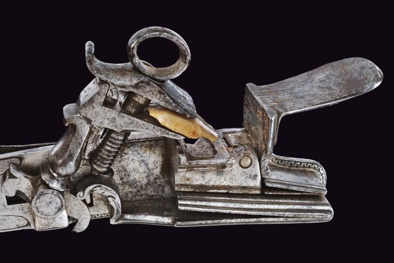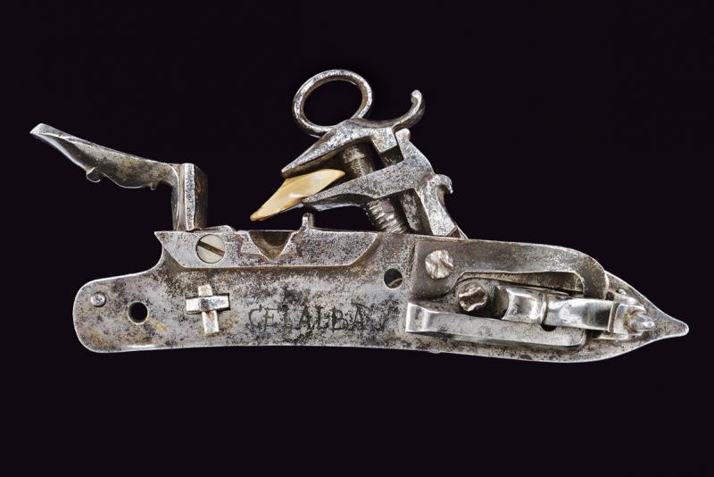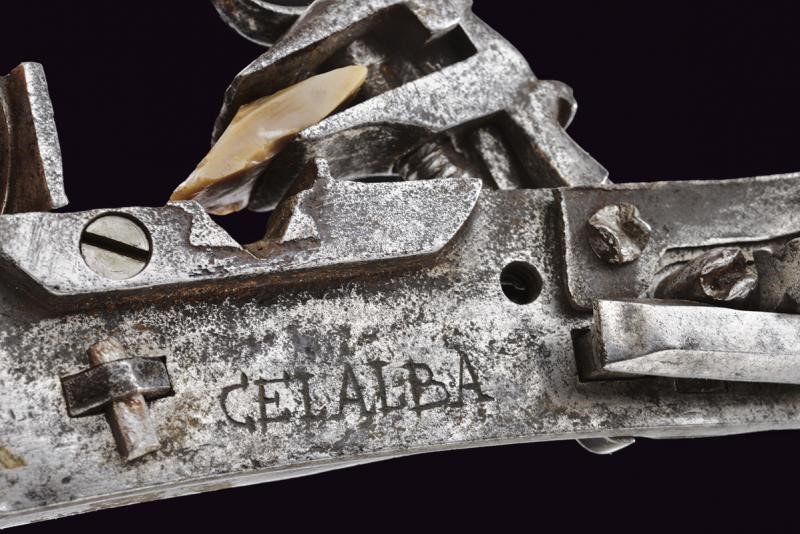 In ferro, con cartella tondeggiante incisa al bordo, con trama geometrica in particolare sotto alla molla e alla coda e nella parte superiore con una linea semplice. Il cane con collo strutturato a balaustro e avente resti di incisioni alla ganascia superiore, questa munita di vite con grosso anello. Molle e scodellino con leggere scanalature. La parte esterna della martellina intagliata a clessidra. All'interno firma "CELALBA".