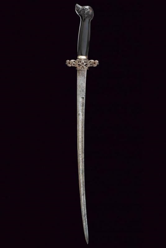 Lama curva a un filo e controfilo, piatta al forte e con resti di incisioni, poi con sguscio centrale e sottile scanalatura dorsale. Bellissimo elso in ferro intagliato e traforato raffigurante due draghi e serpenti. Impugnatura in ebano con pomo a testa di segugio con base faccettata.