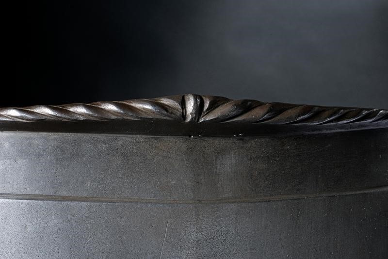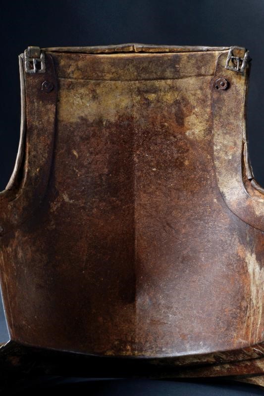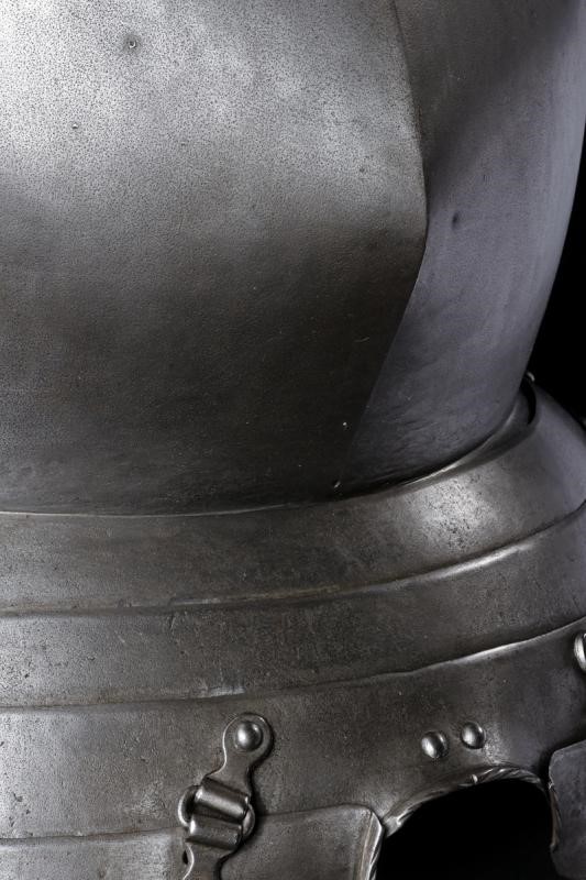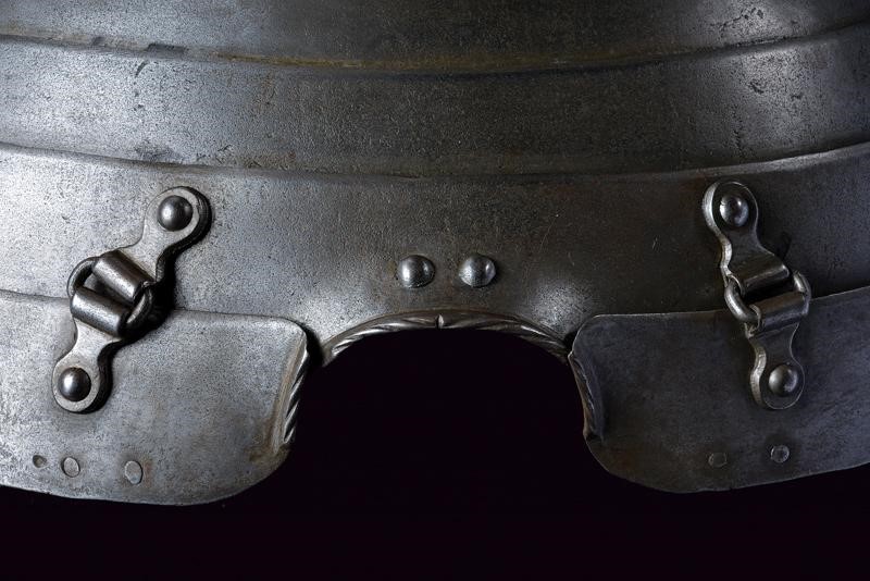 Ben realizzato, di elegante forma costolata in mezzeria e con tapul accentuato. Il margine superiore a lista ribassata culminante in uno spesso cordone dritto ben ribadito e lavorato a fingere il tortiglione. I guardascella fissati con ribattini e recanti cordoni lavorati en suite, muniti anche di fibbie di montaggio. La falda a tre lame e con due bassi fiancali incernierati alla lama più bassa. Al centro forcata con cordoncino a tortiglione ripreso sia sulla falda che sui fiancali. Sul retro bella patina antica.