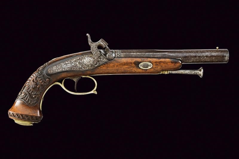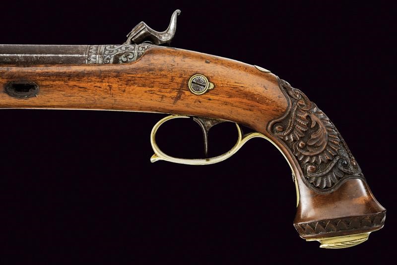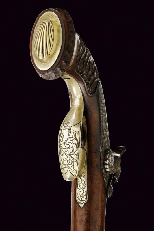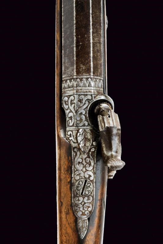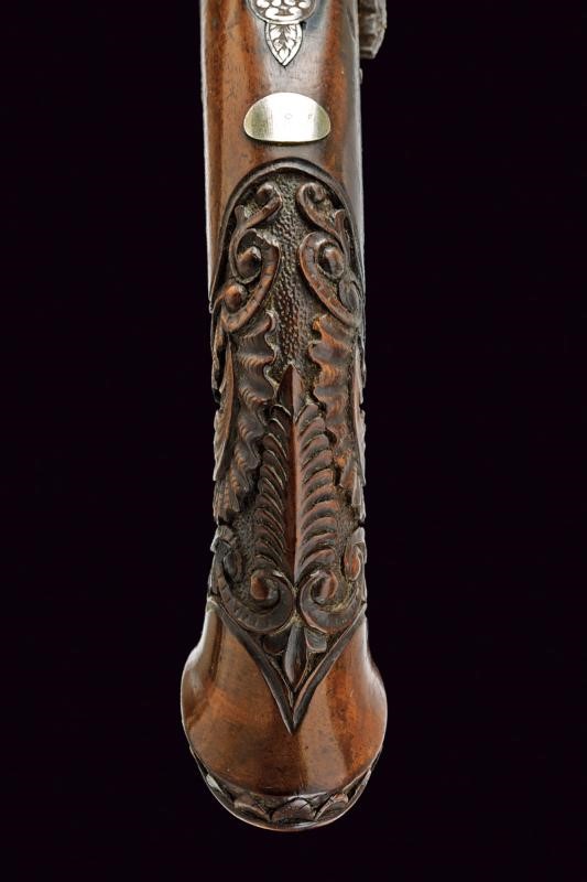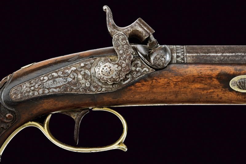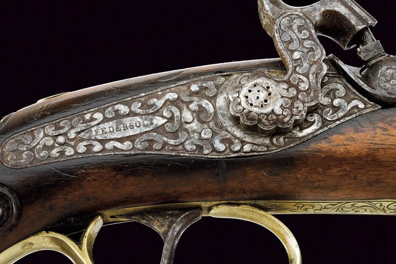 Canna liscia a due ordini, ottagonale nella prima parte, con base finemente incisa, poi tonda, dotata di mirino e con incisione alla volata, cal. 17 mm. Codetta incisa e munita di traguardo. Batteria a molla indietro riccamente incisa a motivi floreali e firmata "PEDERSOLI", la base del cane con bordo ondulato. Cassa a tre quarti scolpita al calcio a motivi floreali in rilievo. Fornimenti in metallo giallo chiaro inciso, la coccia con porta capsule. Bacchetta in ferro. Sul dorso uno scudetto ovale in argento.