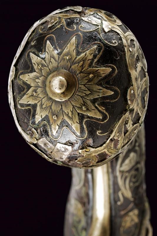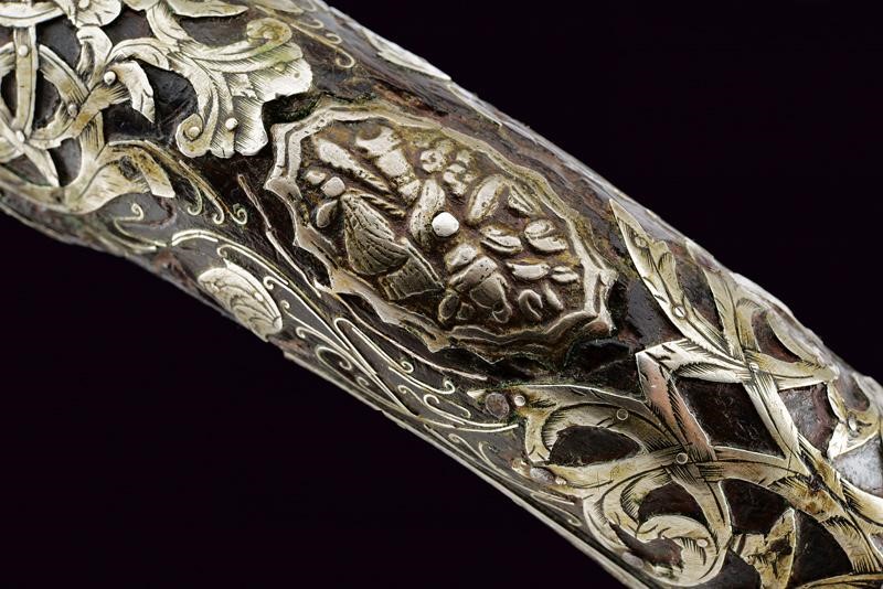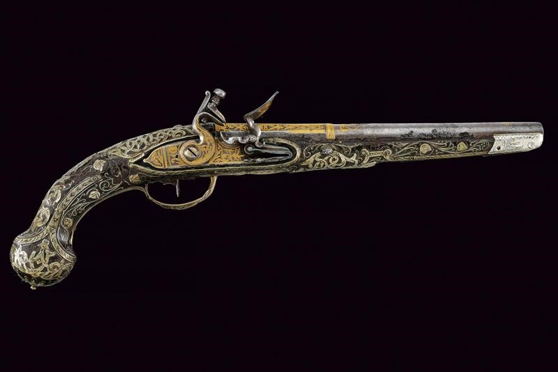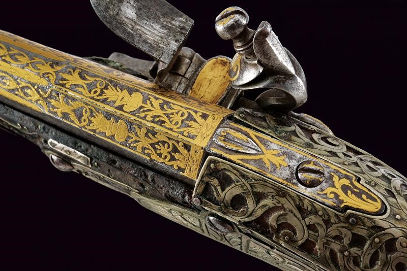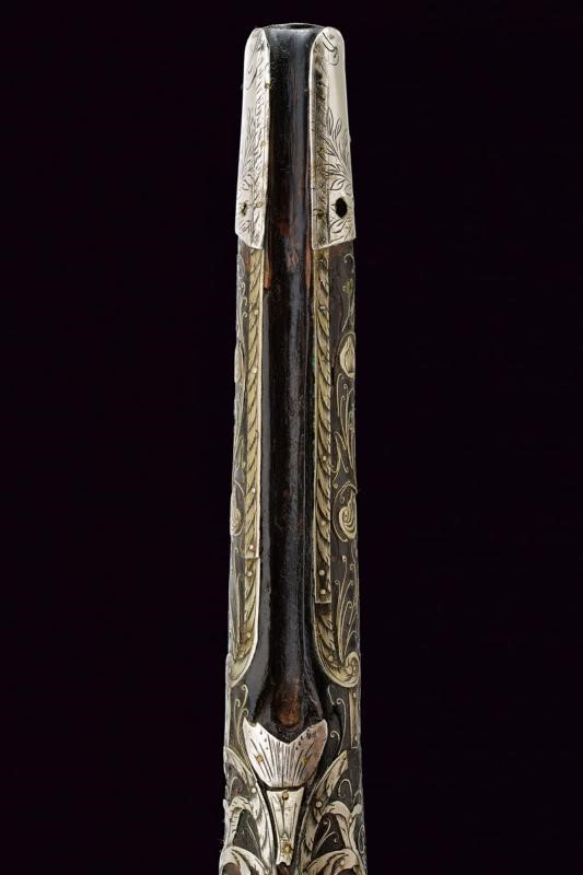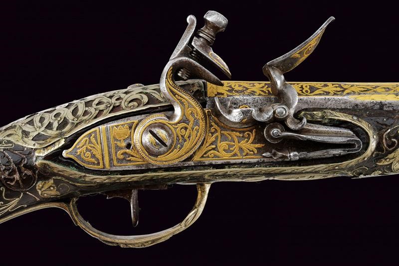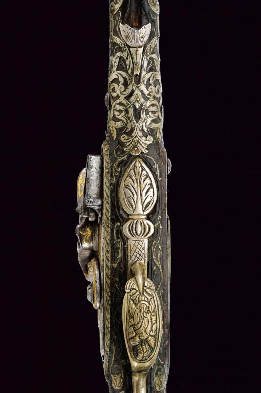 Smoothbore, two-stage,14 mm cal. barrel, octagonal at the first part and then round, richly decorated with gold floral motifs. Tangs decorated in gold and provided with sight. Lock decorated en suite and with anti-friction and sealing systems. Wooden full stock (small missing parts) decorated with silver inlays (various missing parts). Engraved and carved silver mounts with trophies and floral motifs. Missing fake ramrod.