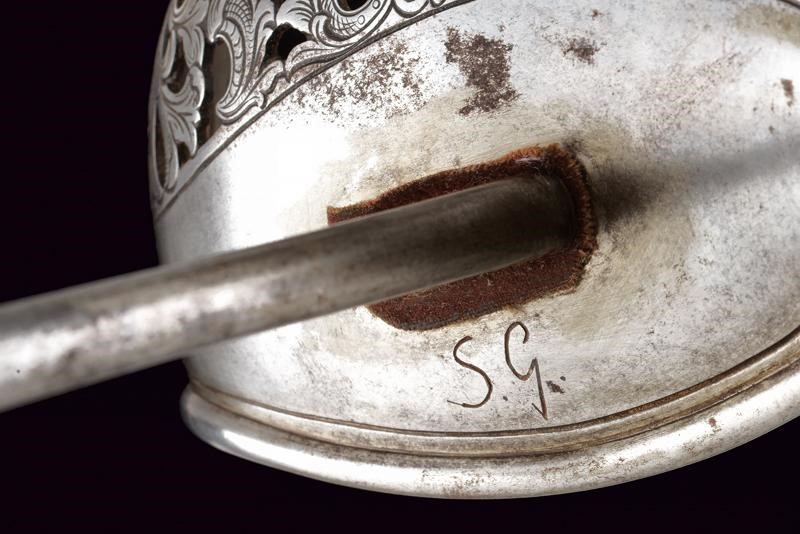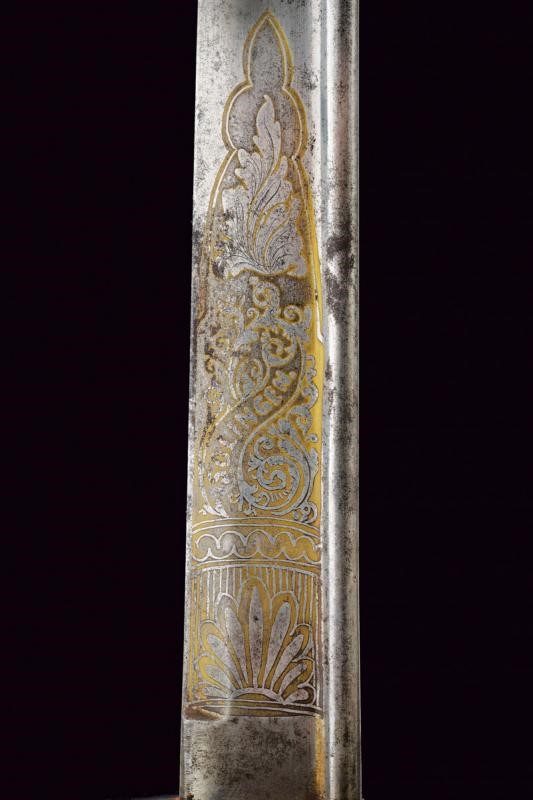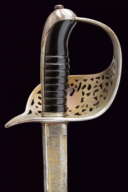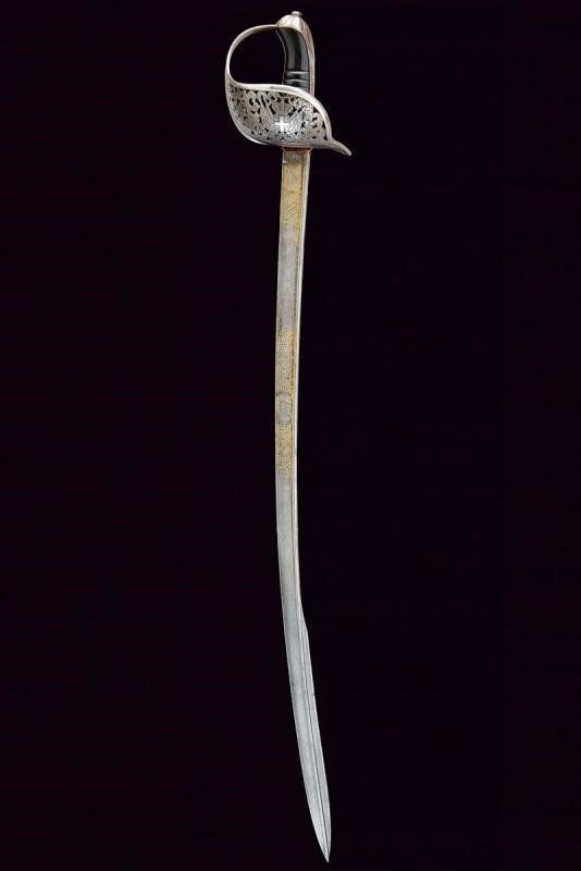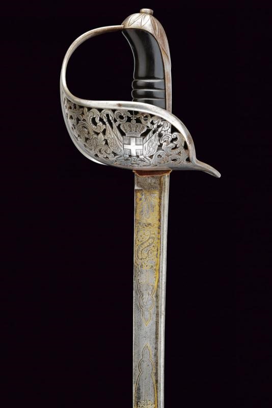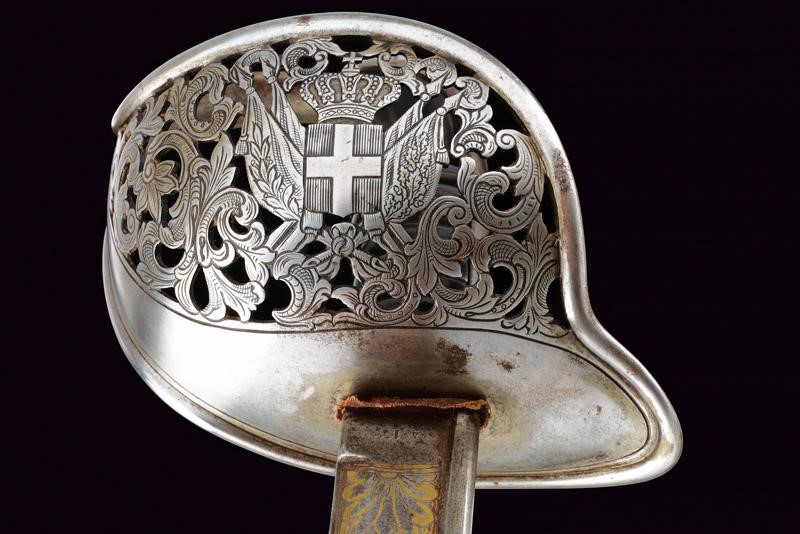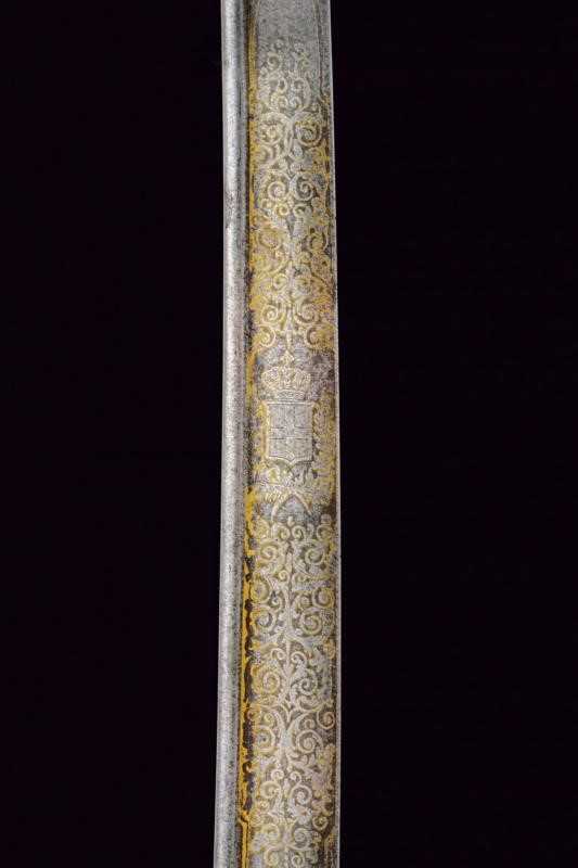 Lama curva a un filo con jelman, finemente incisa e dorata nella prima metà, recante stemma sabaudo sotto corona fra volute, la base firmata "J. E. BLECKMANN" e "SOLINGEN". Fornimento in ferro con vela riccamente traforata, al centro lo stemma sabaudo sotto corona e fra bandiere incorniciate da decorazioni floreali. Alla base monogramma "S. G." Cappetta lunga con scanalatura al pomo. Impugnatura in legno a spire. Priva di fodero.