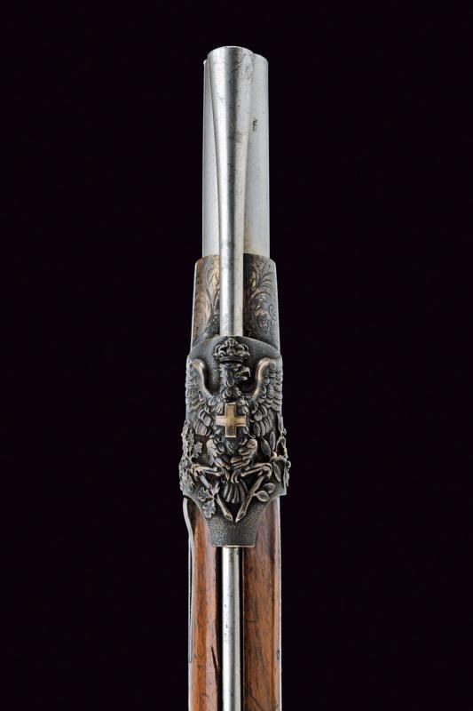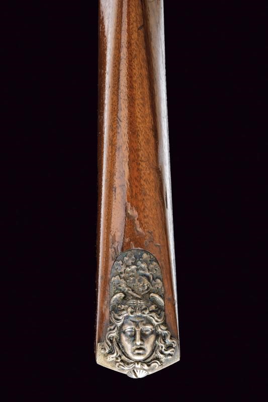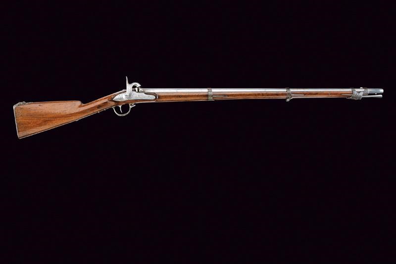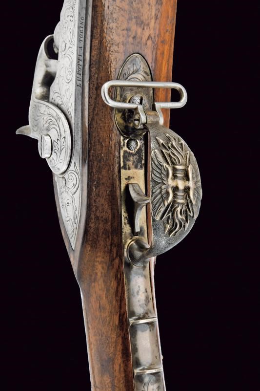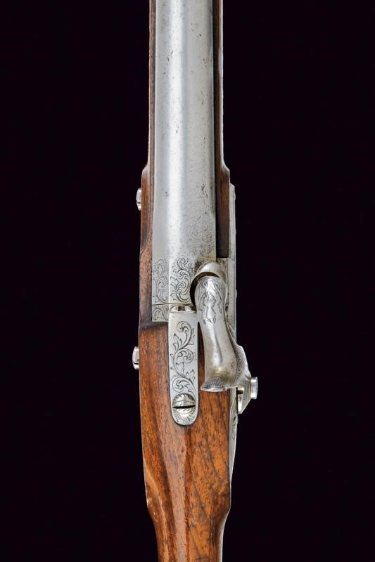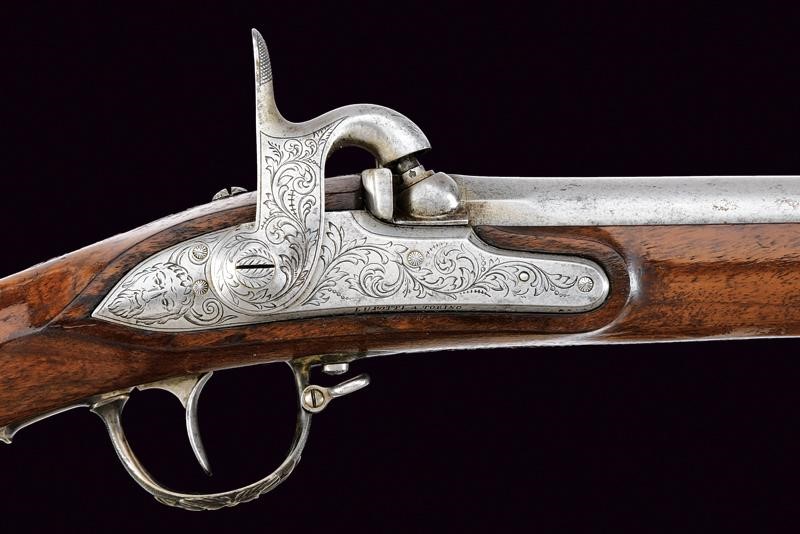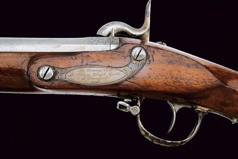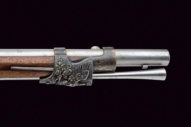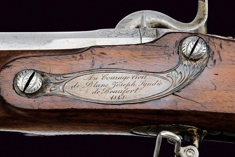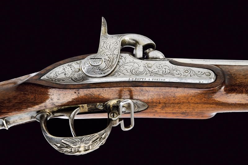 Dono per coraggio. Fucile piemontese d'ordinanza a luminello. Canna tonda liscia con base ottagonale incisa a motivi floreali, dotata di mirino e attacco per la baionetta, cal. 17 mm; codetta incisa e munita di alzo; batteria a molla in avanti con cartella piatta incisa en suite e firmata sul bordo "LUPOTTI A TORINO", la coda tondeggiante ed incisa con testa barbuta e con corna. Cassa intera in legno con fornimenti in argento. La contropiastra con dedica "Au Courage Civil de Blanc Joseph Syndic de Beaufort. 1848.", il ponticello con saette e ali, il calciolo con testa di medusa e decorazioni floreali ed il reggicanna con aquila Sabauda fra fronde di quercia e lauro, tutti in rilievo, il resto con incisioni a volute. Bacchetta in ferro.