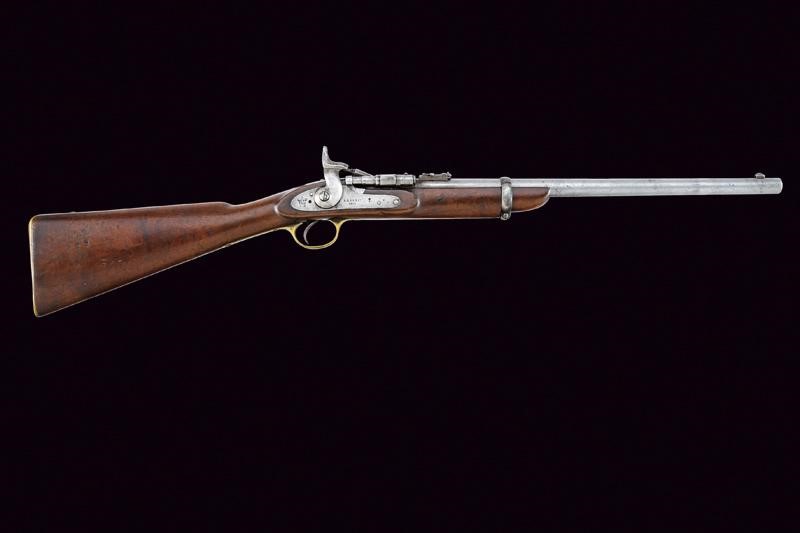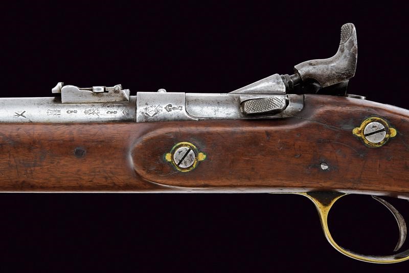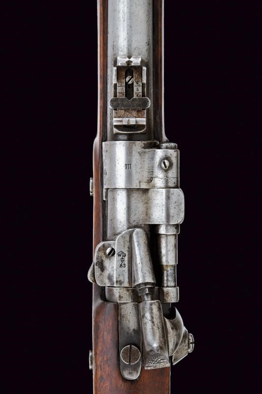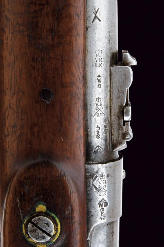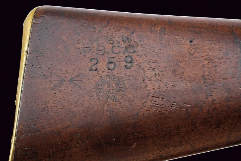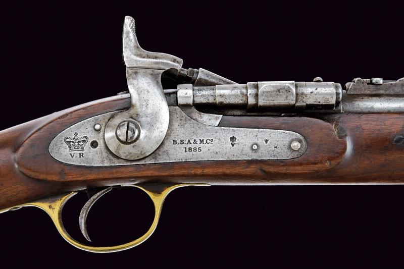 Canna tonda rigata (rigatura visibile, qualche intaccatura all'interno, una deformazione verso la volata), dotata di mirino, con vari timbri britannici del War Department. Cal. 14,8 mm. in volata. Otturatore funzionante, chiusura ben salda. Batteria marcata "B.S.A. & M.C.o" datata "1885" con timbro a corona sormontante "VR" (Victoria Regina) e con punzoni broad-arrow. Mezza cassa in legno. La pala con timbro di Birmingham del War Department del 1885 e con marcatura dell'accademia militare pubblica del New South Wales (Australia) "N.S.W. P.S.C.C." Segni d'uso e del tempo. Raro con queste marcature.