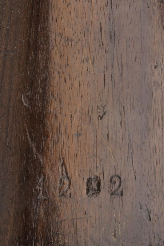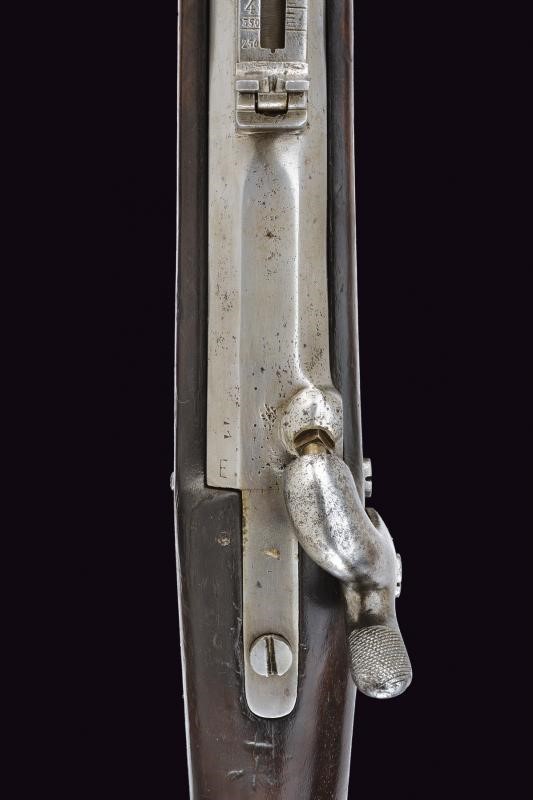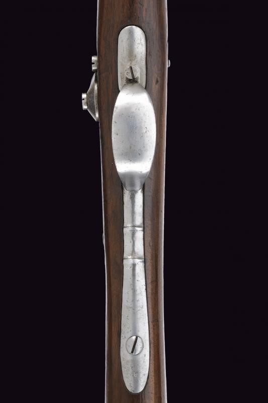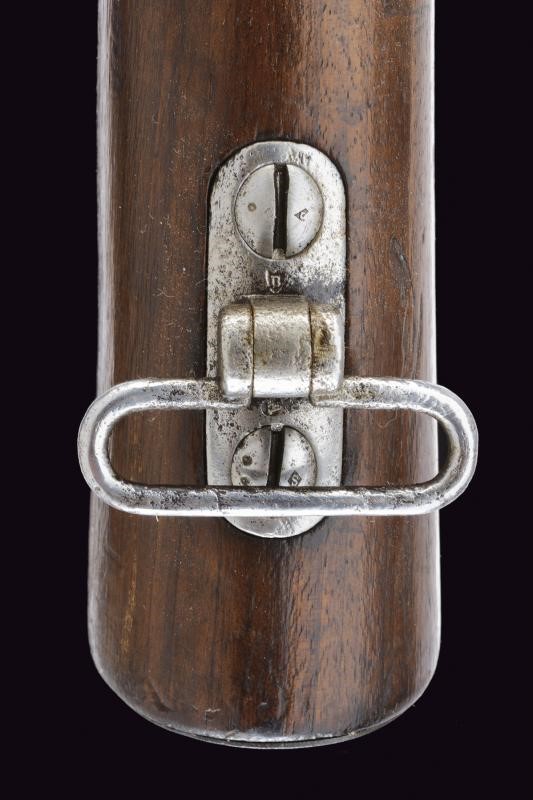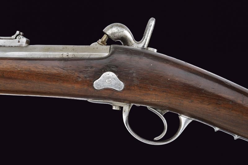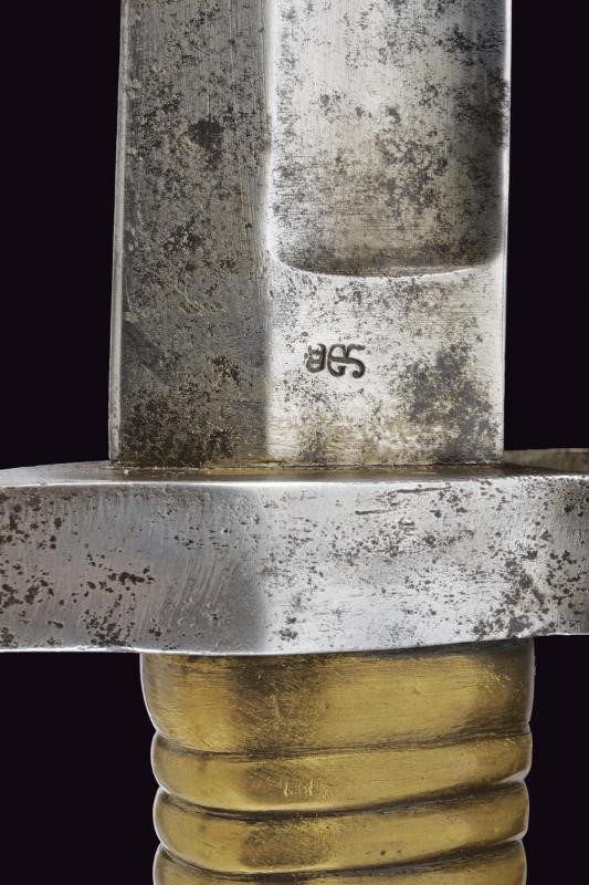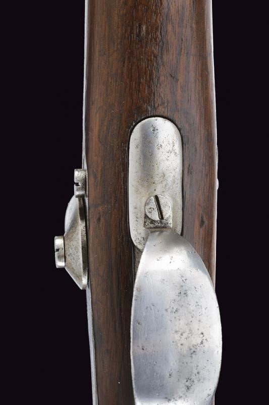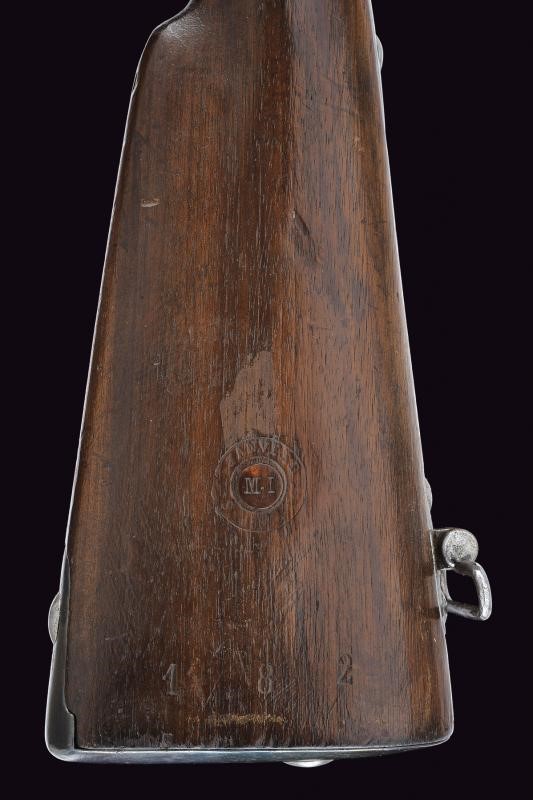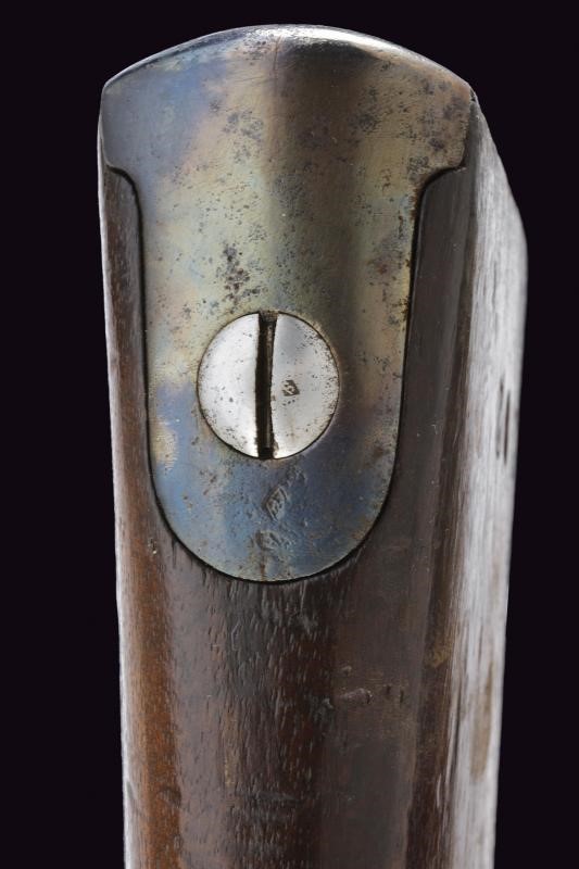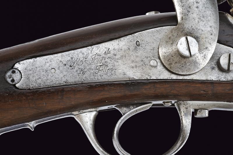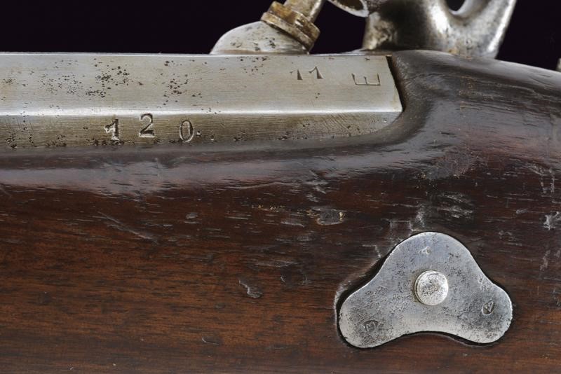 Canna tonda con culatta ottagonale, rigata (forti intaccature all'interno, la rigatura solo parzialmente visibile), con resti di punzoni in culatta. Cal. 19 mm. in volata. Alzo abbattibile e regolabile senza cursore. Batteria a molla indietro con marcatura "M.re Imp.le de Tulle". Meccanica funzionante. Cassa intera in legno. Pala con resti di timbri. Fornimenti in ferro. Bacchetta mancante. Con sciabola-baionetta di 69,4 cm. con lama intaccata e impugnatura in ottone, priva di fodero.